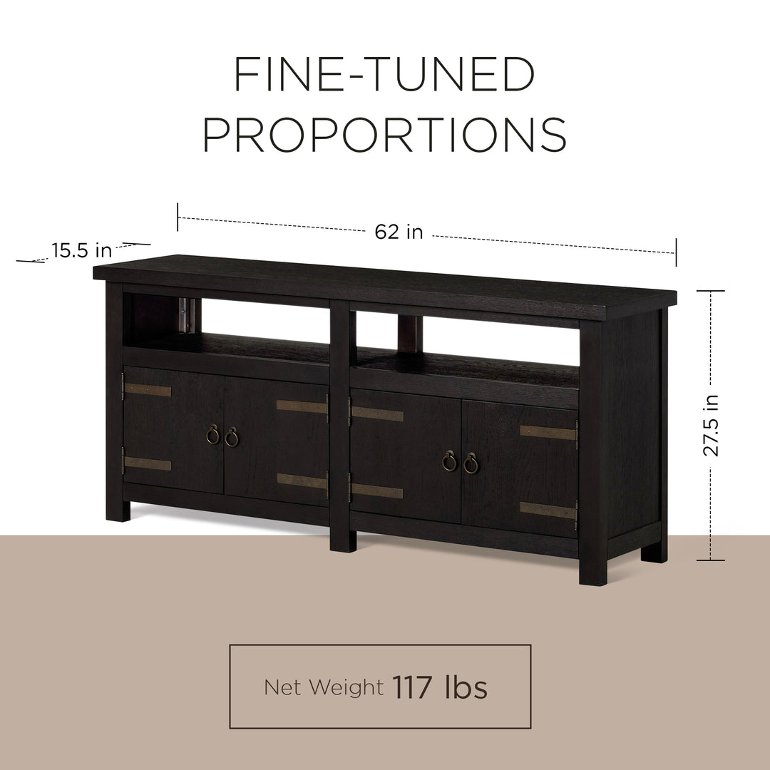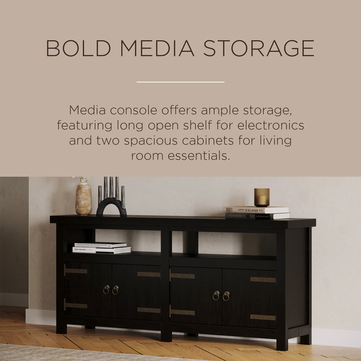 - Media console with an open shelf, ideal for electronics that require remote access, and 2 large cabinet bays with double doors to neatly tuck away odds and ends