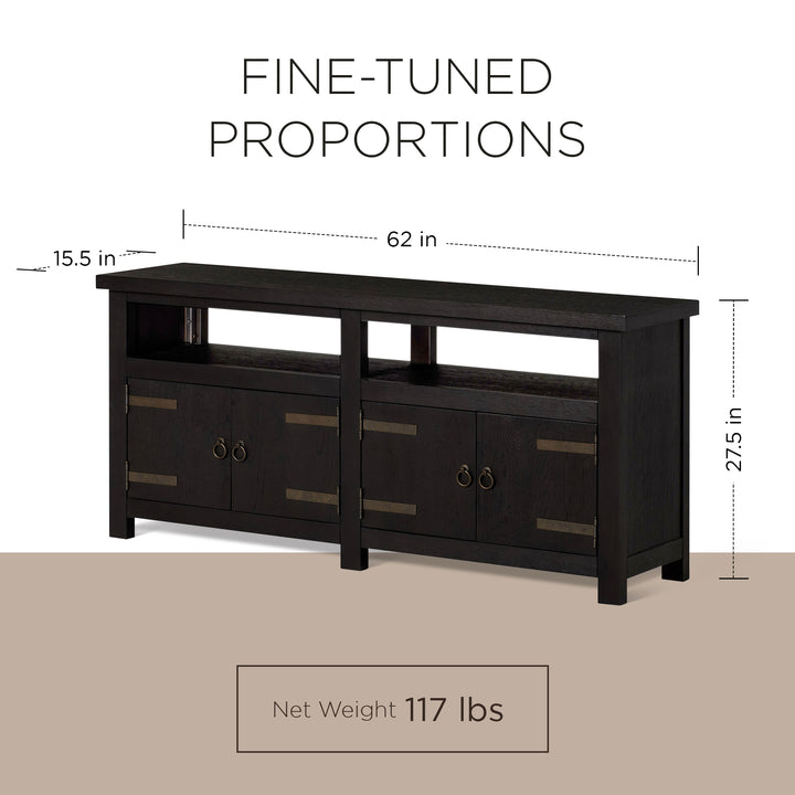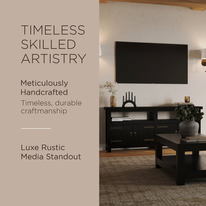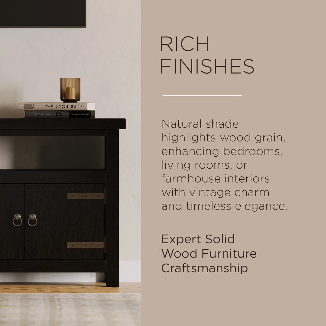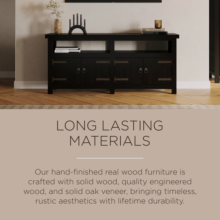 Brimming with luxe, rustic details, our quality Luca Wooden Media Unit and Entertainment Center is destined to be the star of your next soirée. With embellished, large metal door hinges, sophisticated ring cabinet pulls, and a bold stature, this wood TV stand has the space and style to house your modern entertainment must-haves with ease and grace. An extra-long open interior shelf is the ideal place for your smart electronics requiring remote access, and two roomy television cabinet bays (both with double doors!) effortlessly keep all your living room necessities neatly tucked away and out of sight. A rich, natural wooden finish sets this sideboard table apart from the crowd, while its narrow, transitional silhouette ensures it mixes well with vintage, country, and farmhouse aesthetics. At Maven Lane, our well-made home furniture is meticulously handcrafted with methods to stand the test of time including hand finishes displaying an impeccable attention to every small detail, and sturdy mortise-and-tenon joinery techniques which promote strength and longevity. Furthermore, by utilizing premium materials and kiln-dried hardwood in our solid wood furniture, we’ve solidified the superiority of craftsmanship you’ve come to expect from Maven Lane. Be sure to view the other pieces in our furniture collection. We've carefully curated an entire medley of heirloom-quality pieces that can be mixed and matched to create the aesthetic your home has been seeking. Given the handmade nature of our products, minimal variations may occur in color, tone, and wood finish.