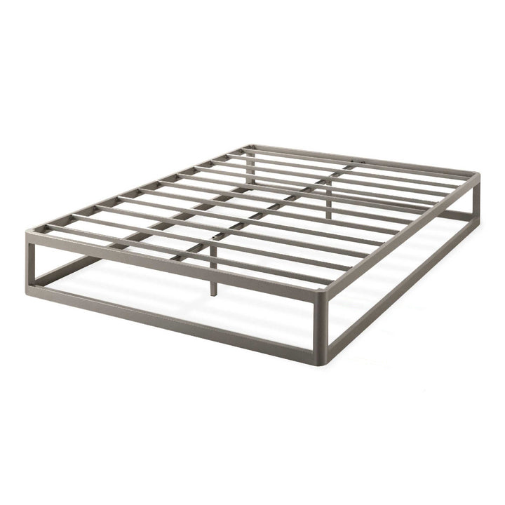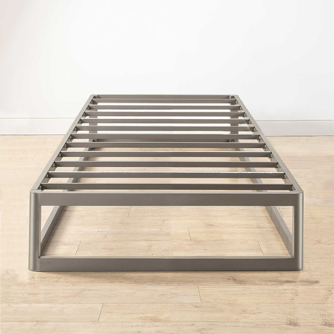 - Sleek metal bed frame with an industrial-style low profile, offers durability and style to your bedroom