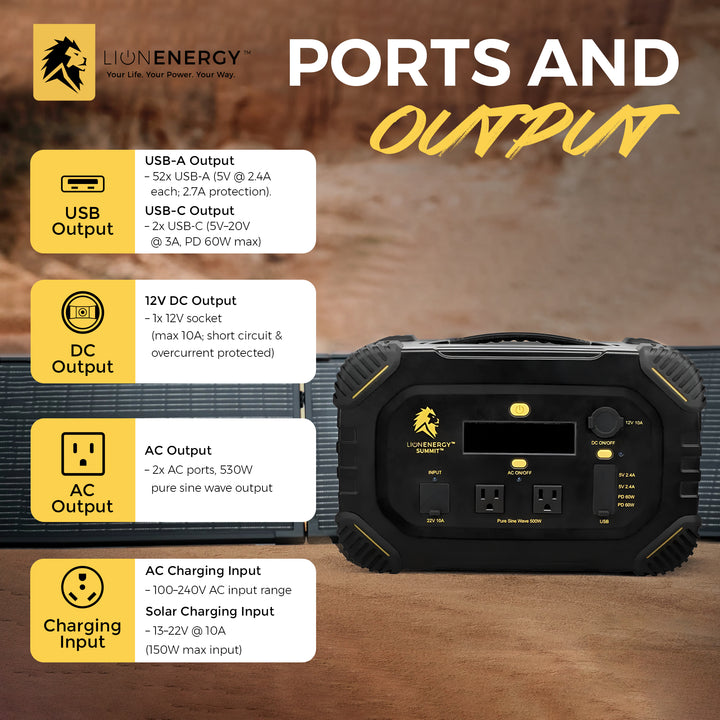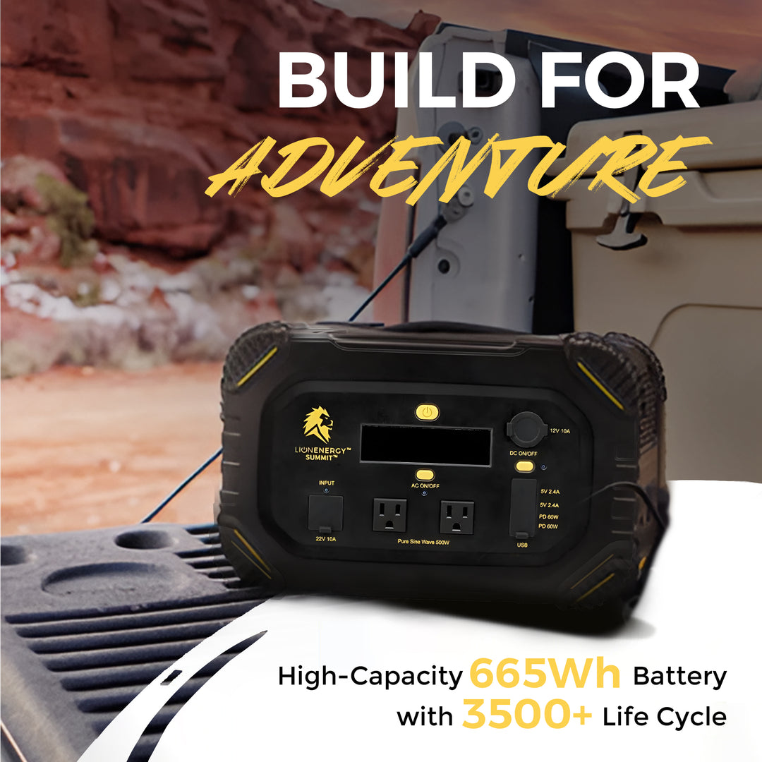 - Complete off-grid kit includes the Lion Summit portable power station with 665 Wh capacity, 530 W pure-sine wave inverter,