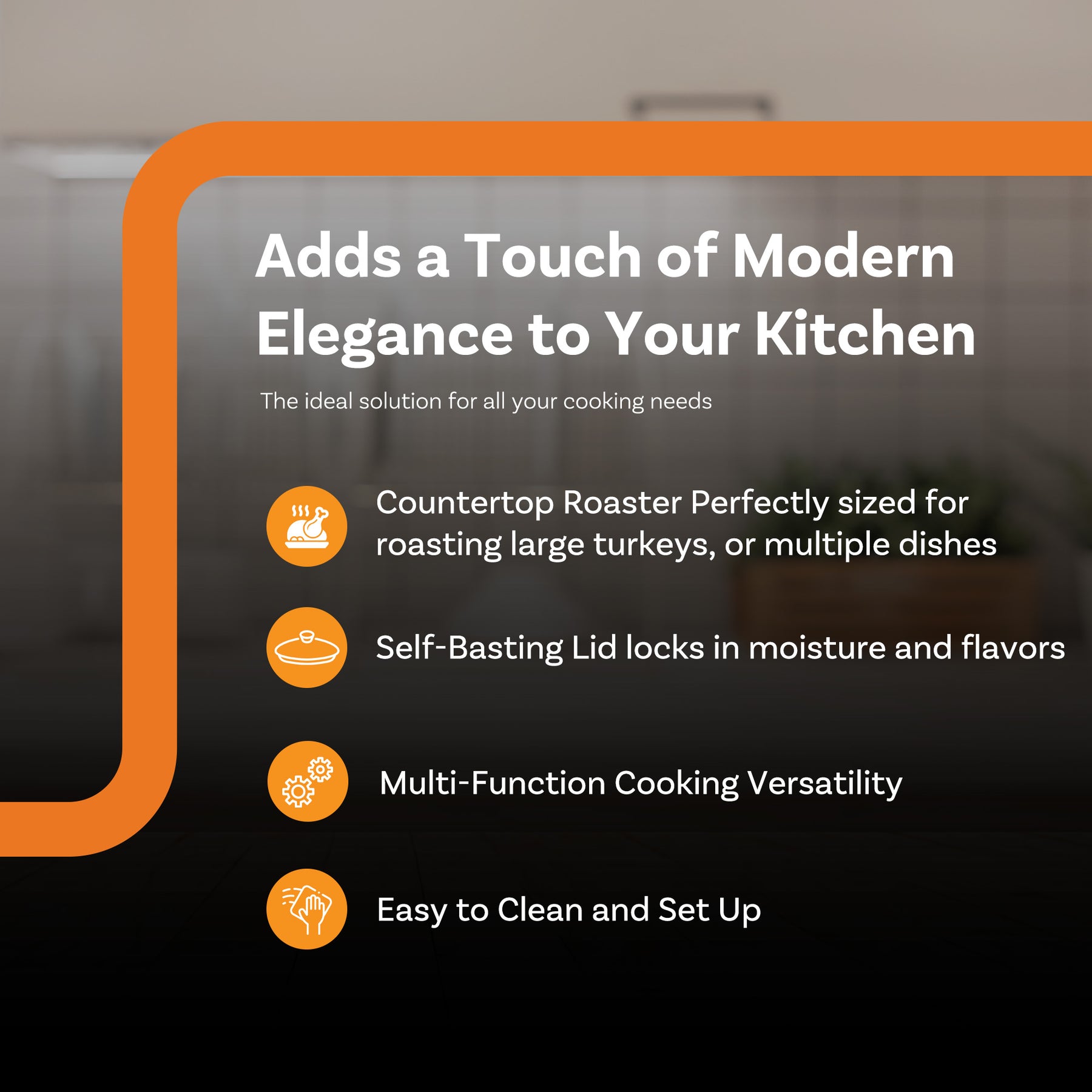 Transform your cooking experience with the Complete Cuisine Electric Roaster Oven with Self-Basting Lid. Designed for convenience and versatility, this roaster oven makes meal preparation effortless, whether you're hosting family gatherings, preparing holiday feasts, or cooking everyday meals. Its spacious 22-quart capacity accommodates large turkeys, roasts, or multiple dishes, saving you time and effort in the kitchen.
