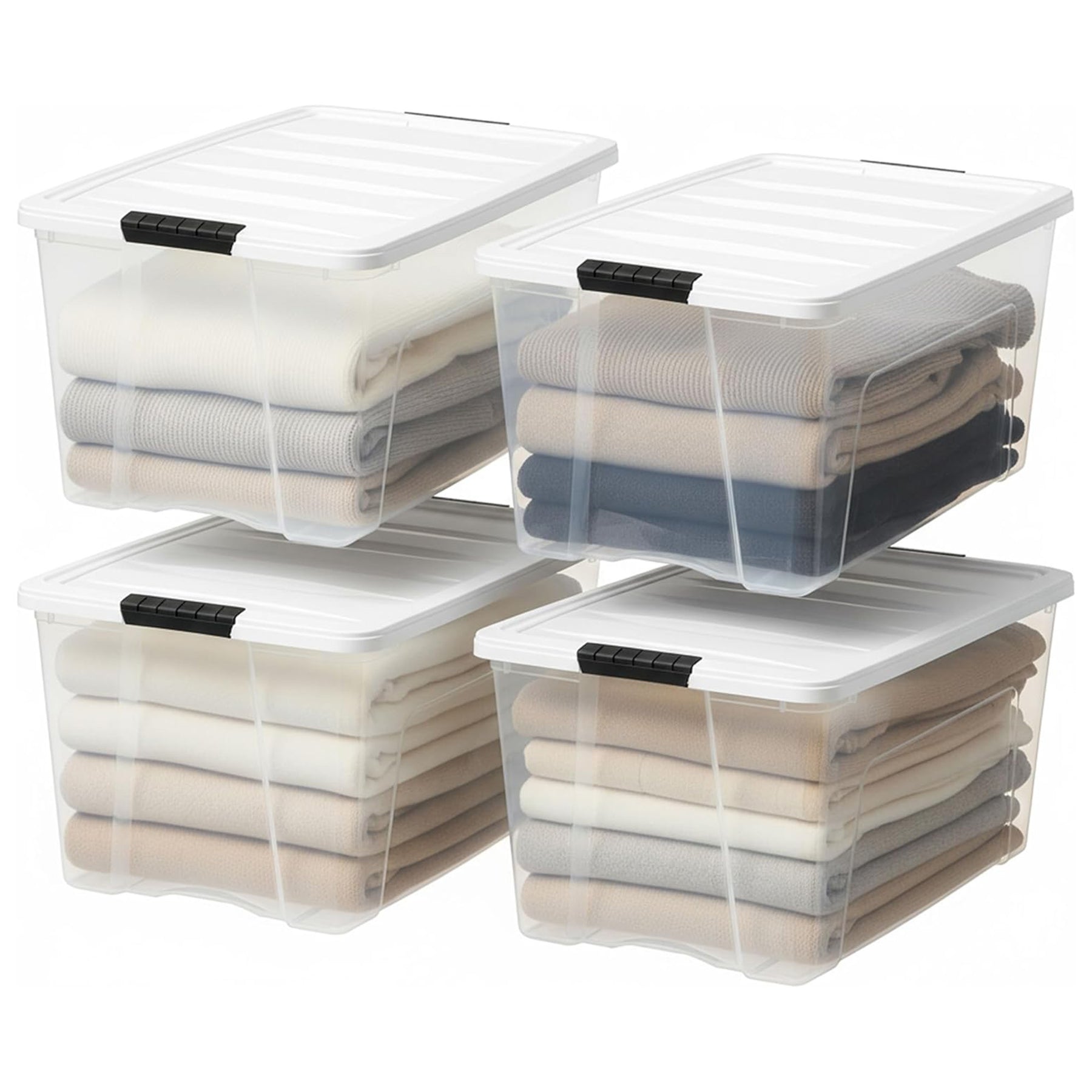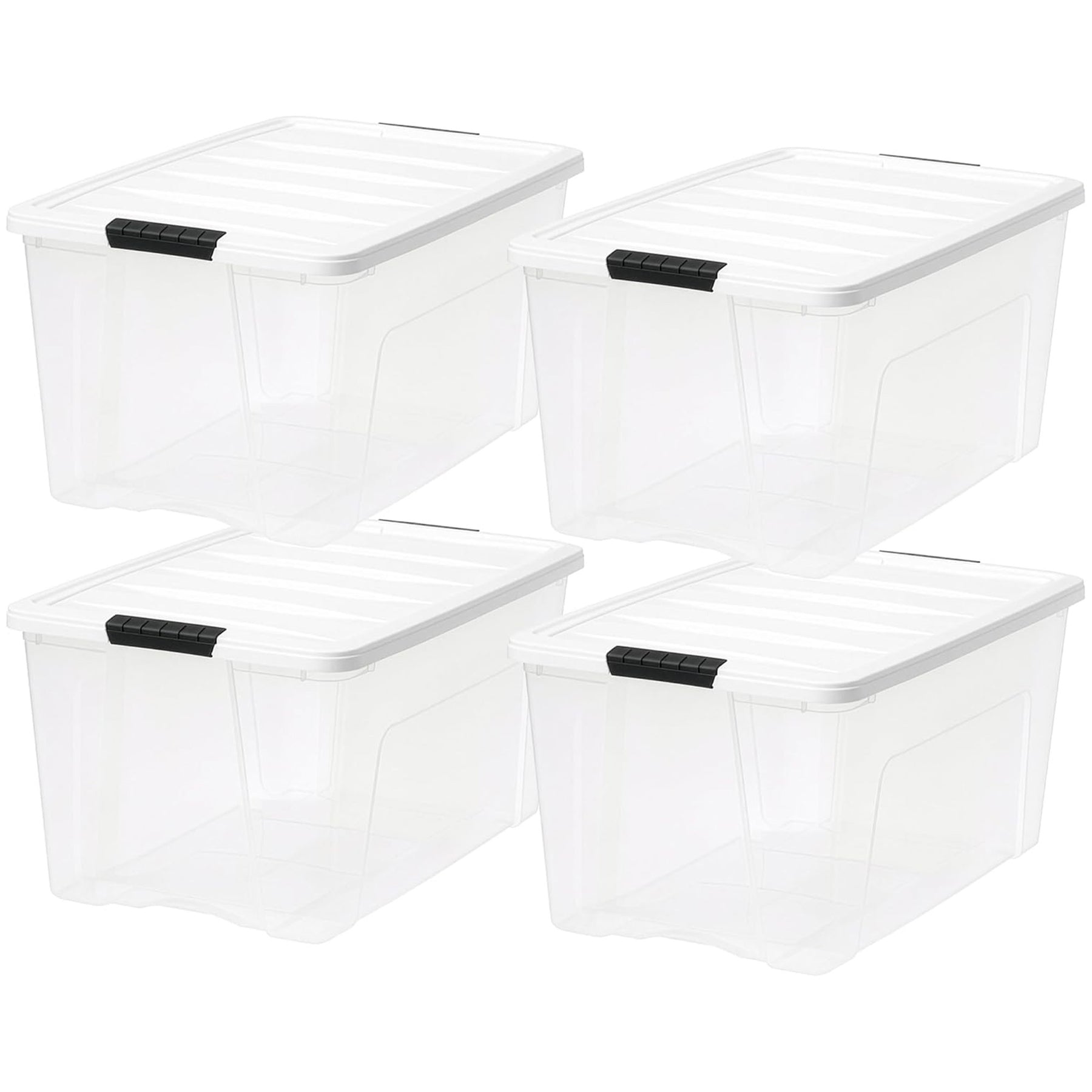 IRIS USA 4 Pack 72 Quart Stackable Plastic Storage Bins with Lids, Clear/White