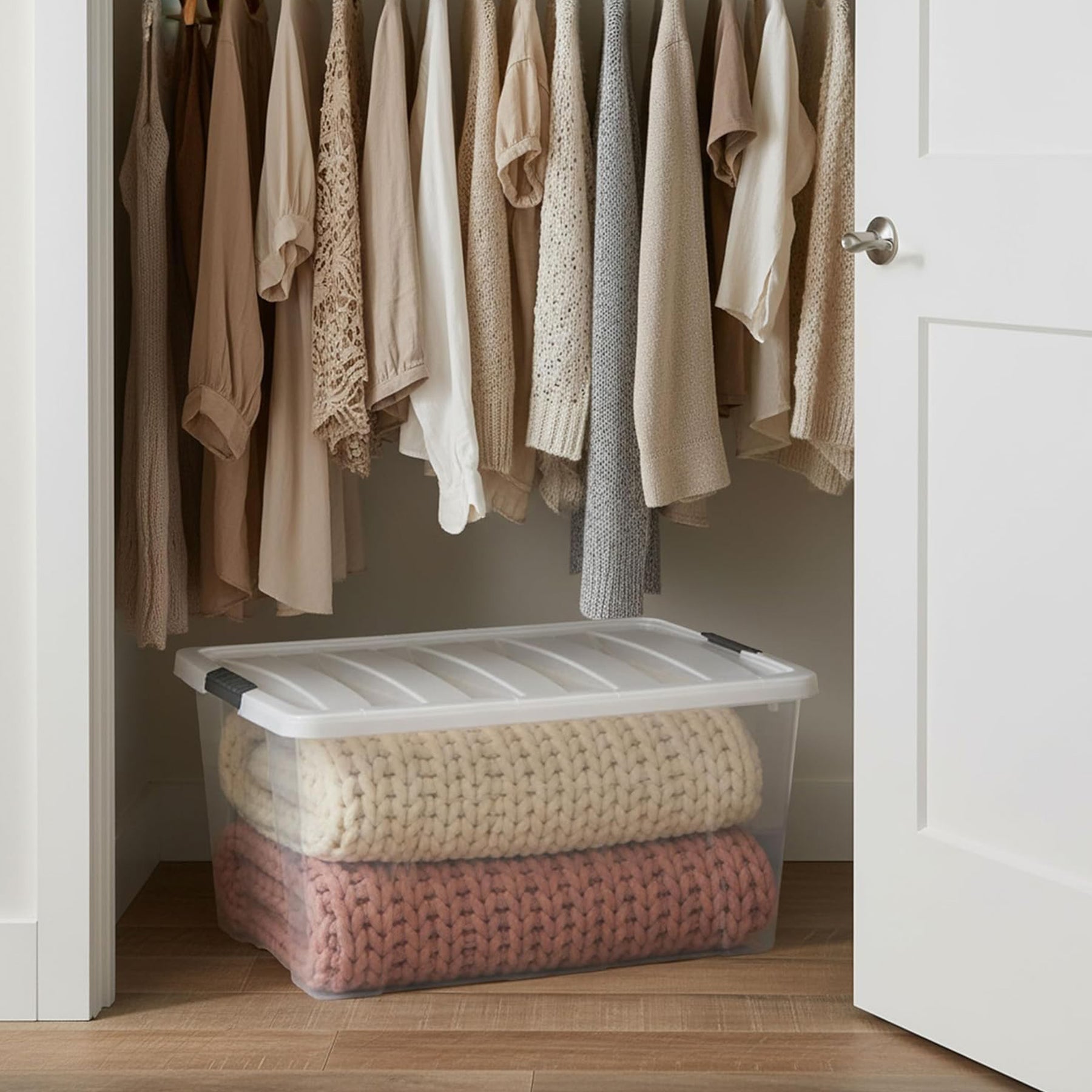 - A handy handle on the bottom of the bin, makes it easy to pull it out even from high shelves, while secure buckles keep lid in place