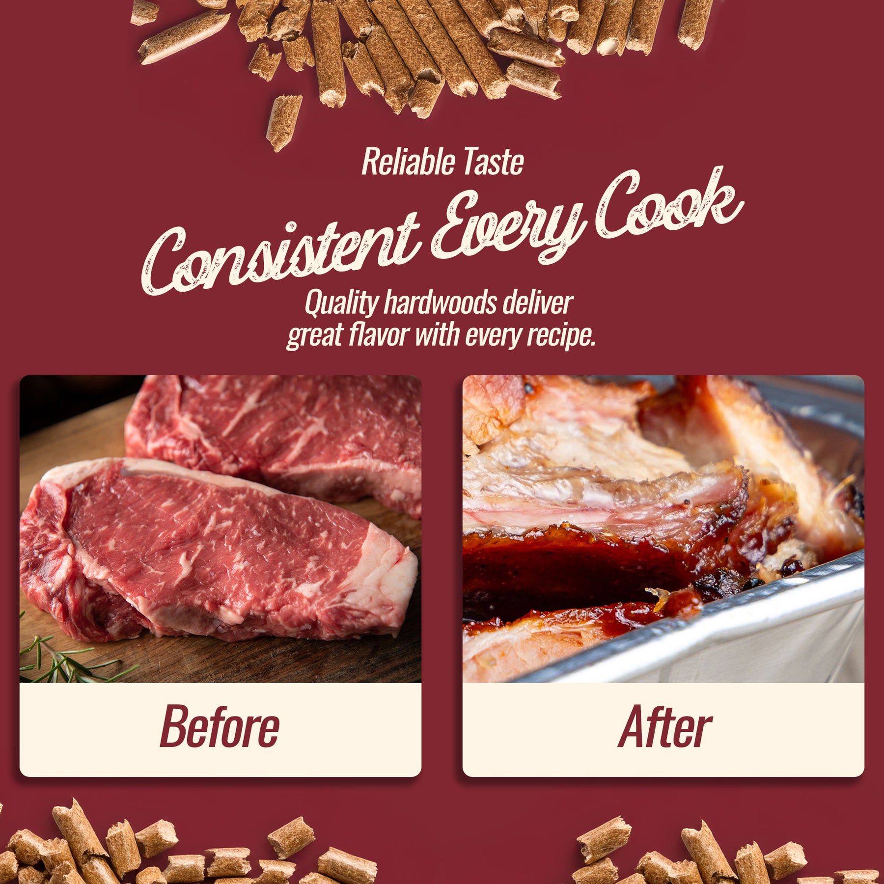 - Premium blend of Hickory, Oak or Alder, Maple, and Cherry hardwoods delivers rich, hearty smoke with a subtle sweetness—perfect for beef, pork, poultry, seafood, veggies, wild game, and cheese