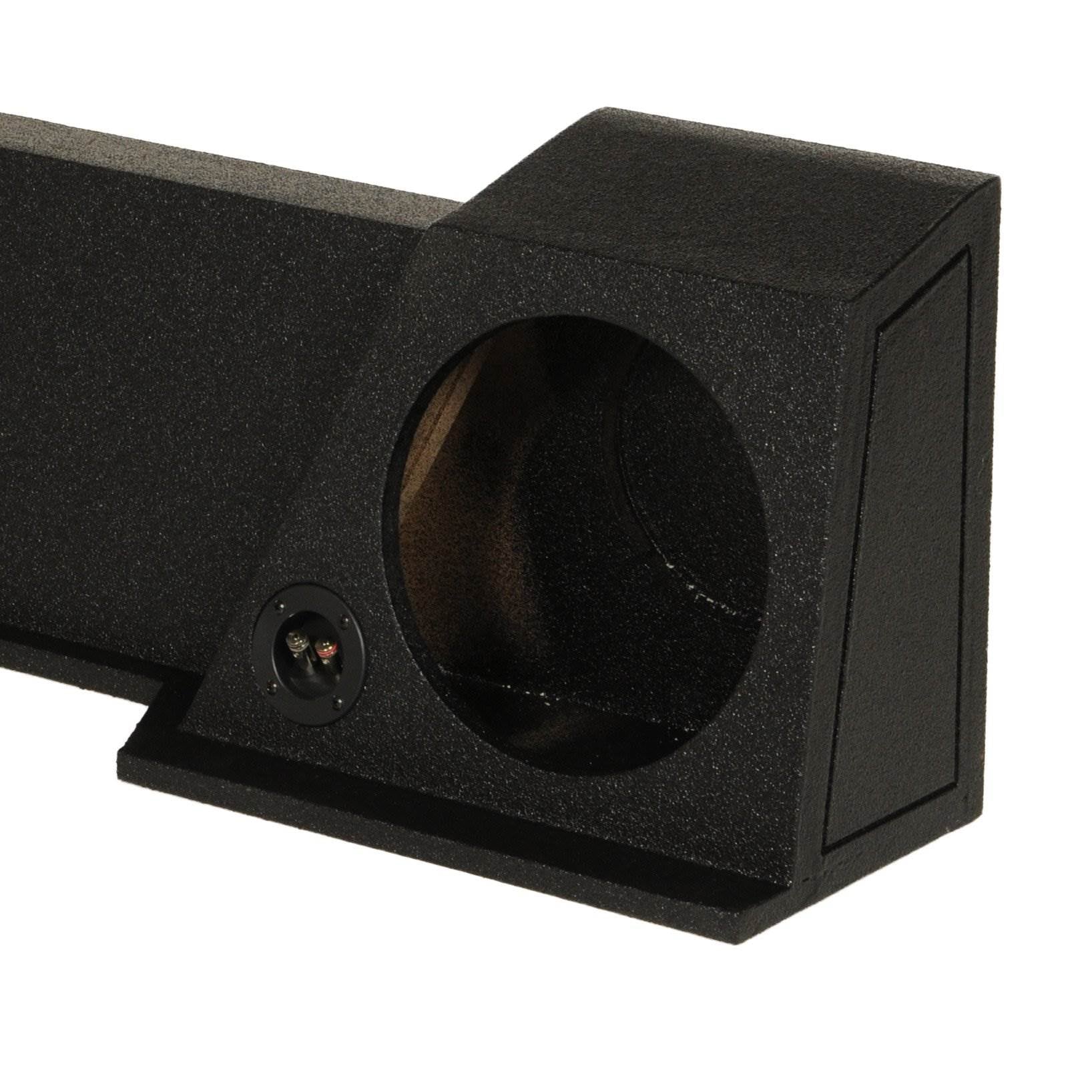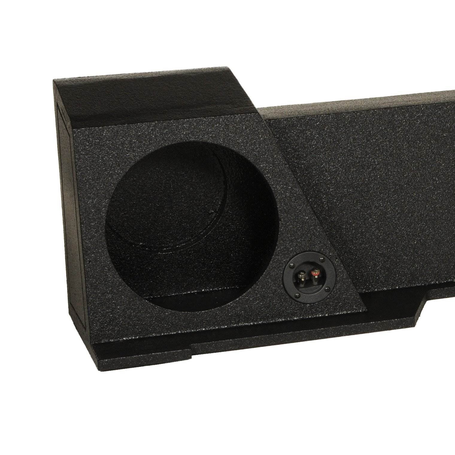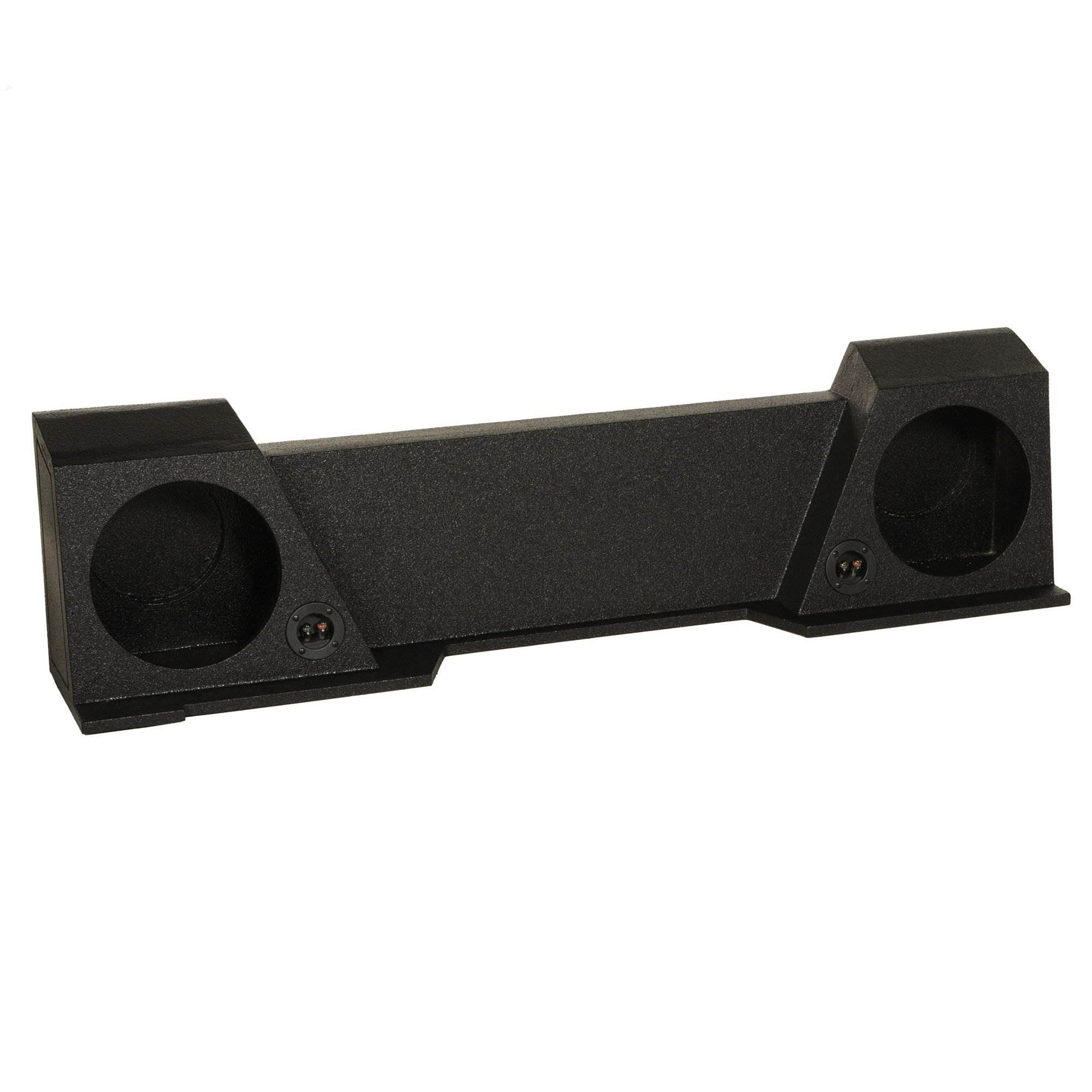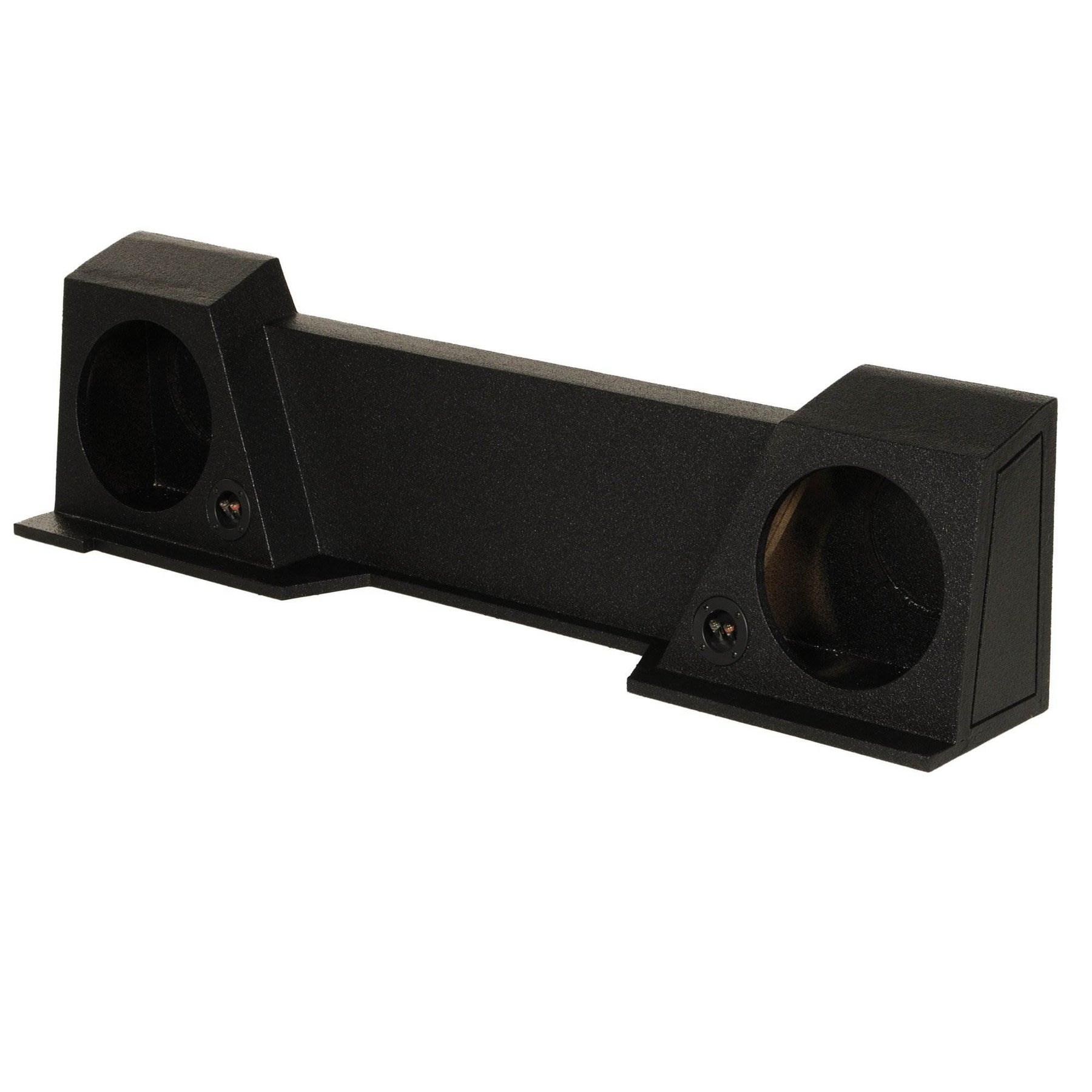 This 2 hole enclosure fits a pair of 10 inch subwoofers. The underseat downfire design is ideal for placement near hump under the seat. It's made with MDF and finished with durable bed liner.