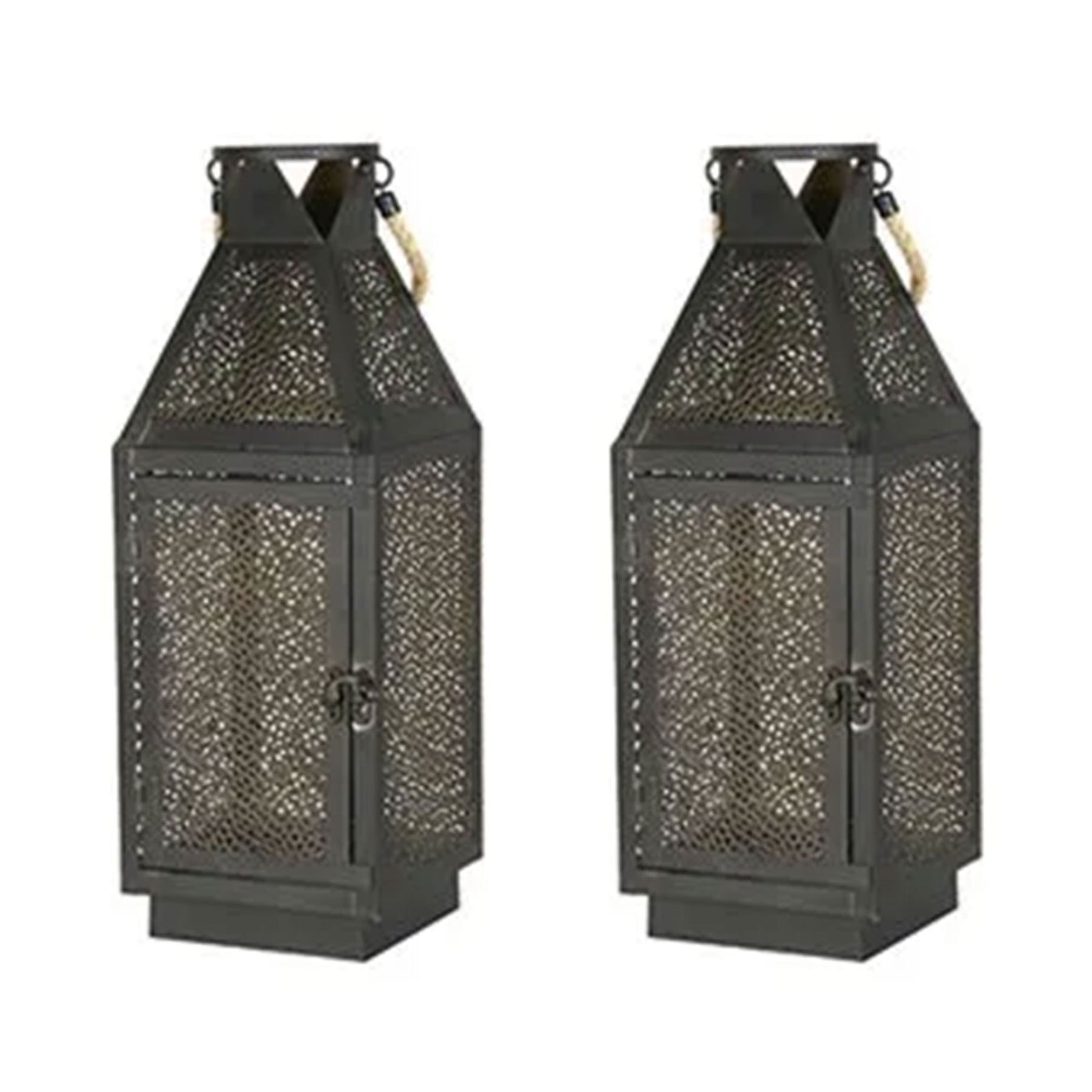 Enhance the ambiance of your indoor space with the 2-pack of Four Seasons Courtyard 16-Inch Battery-Powered 20 LED Filigree Lantern with Timer.