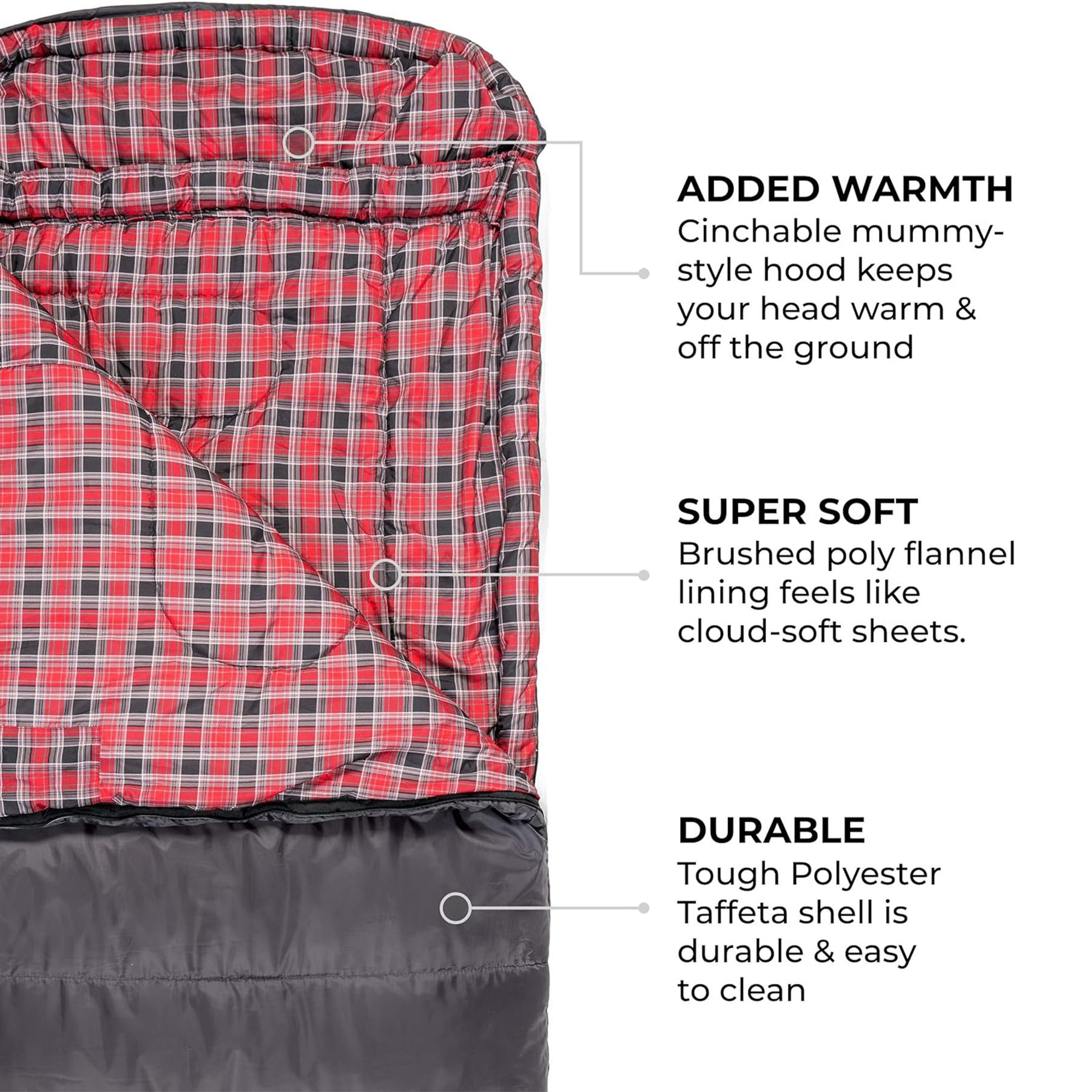 • Sleeping bag that lets you experience the luxury of a soft poly-flannel lining that ensures a cozy night's sleep, making every camping trip a relaxing retreat
