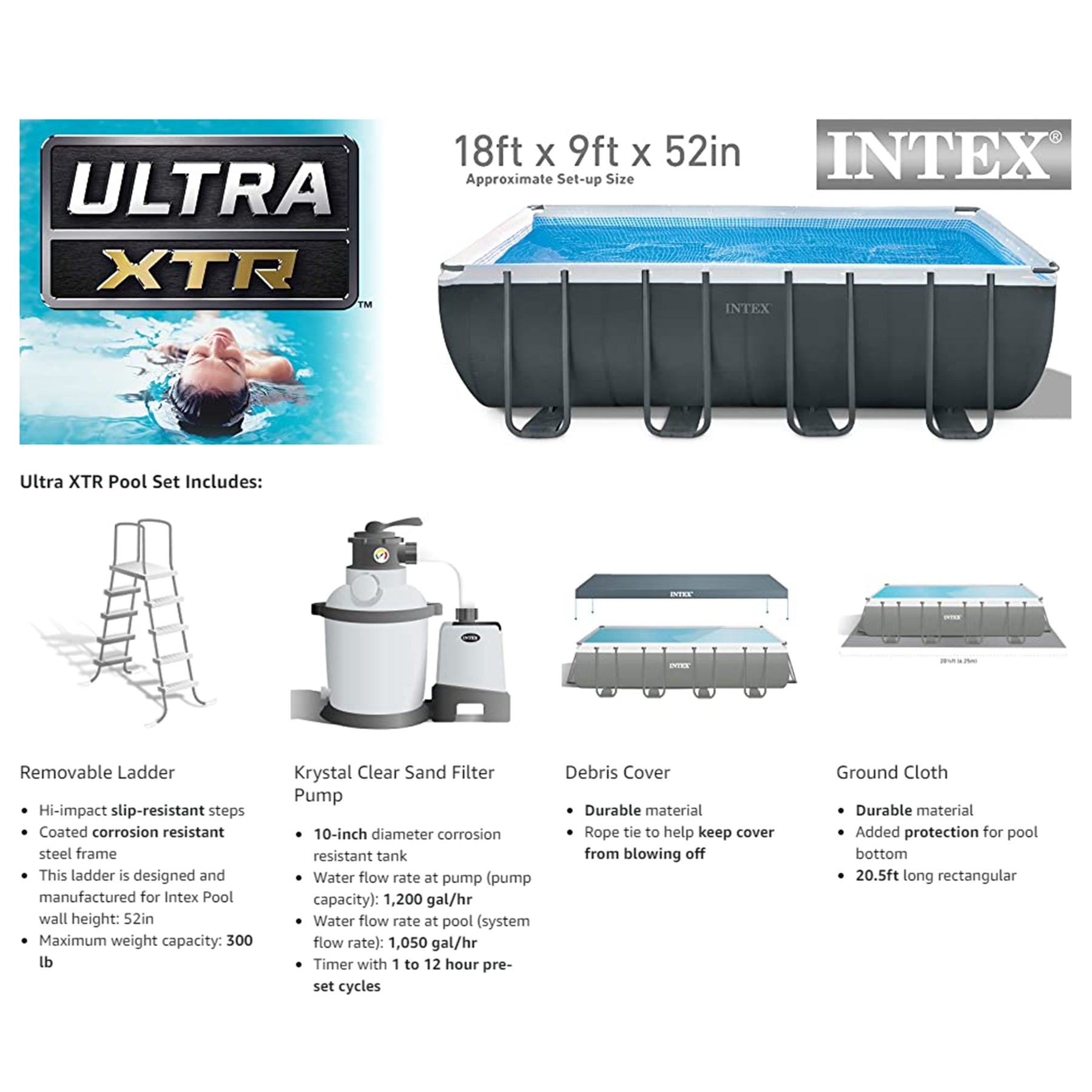 The rectangular swimming pool design is perfect for narrow backyards, lap swimmers, and pool games. The Ultra Frame design provides excellent durability and a sleek gray finish, all while making setup quick and easy. This pool includes everything you need for a great pool experience, including the powerful Krystal Clear 110-120V 1,200 gallon per hour sand filter pump, ladder, debris cover, and ground cloth.