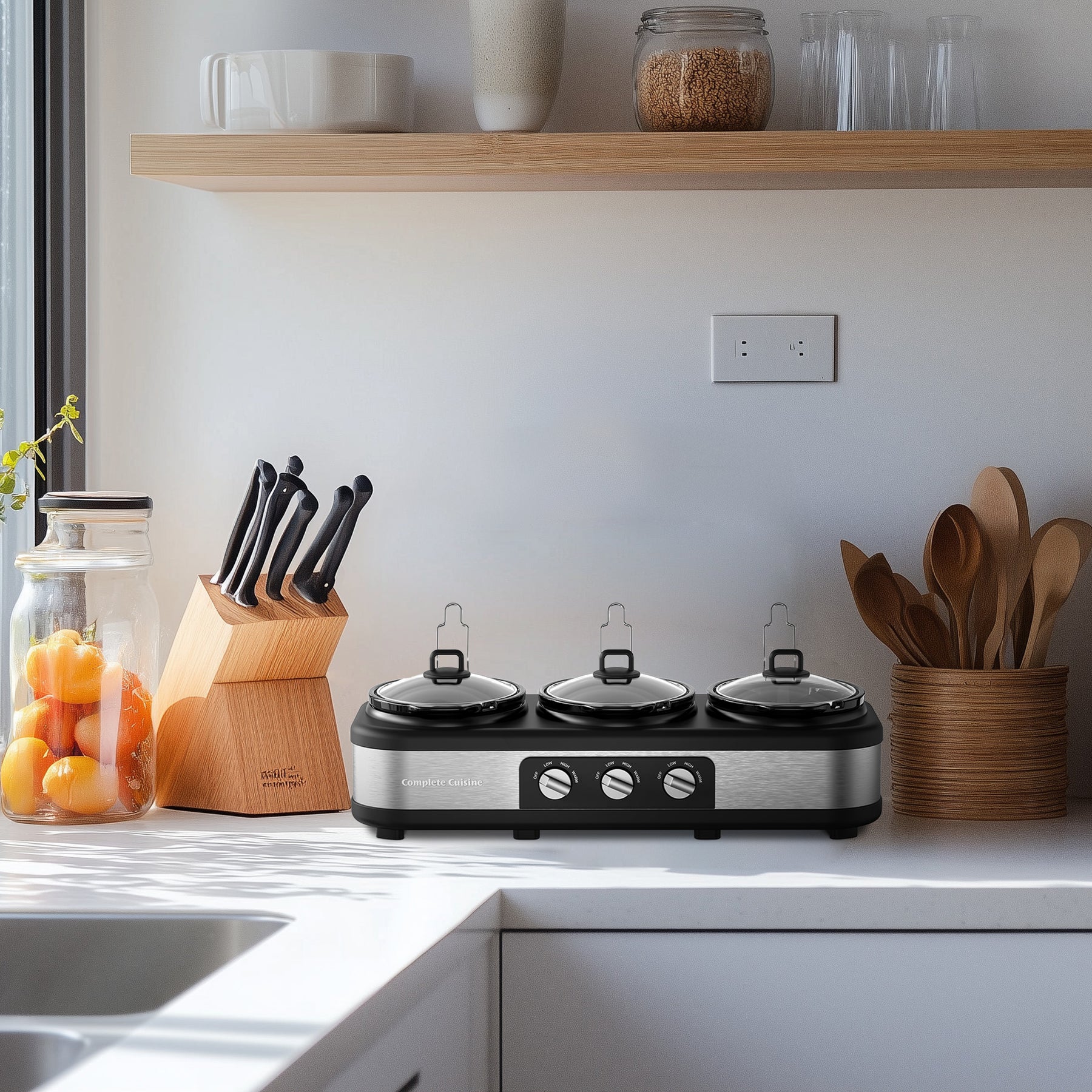 Complete Cuisine Stainless Steel Triple Slow Cooker and Buffet Server, 2.5 Quart