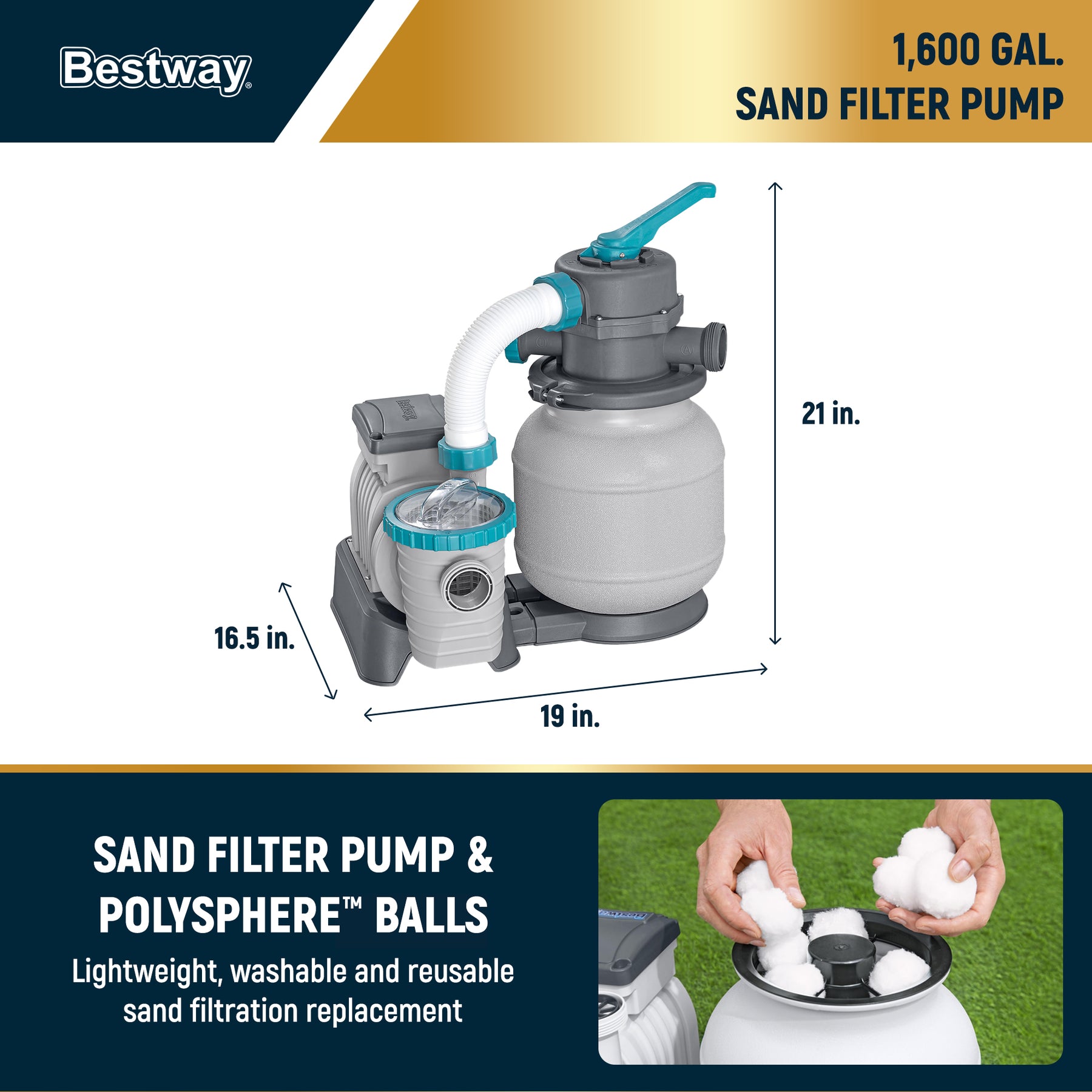 The Tritech liner is constructed with a 3-layer material that offers added strength and resistance to punctures over standard PVC liners, while innovative Polar-Shield weather defense technology protects the liner against outdoor elements, even in cold temperatures, allowing the pool to stay up through all 4 seasons. This pool kit includes a 1,600-gallon sand filter pump, reusable Polysphere pool filtration balls, a pool ladder and a cover. The Polysphere filtration balls are a lightweight, washable and reusable sand alternative that ensures efficient water filtration and lasts 4 to 6 months with proper care.