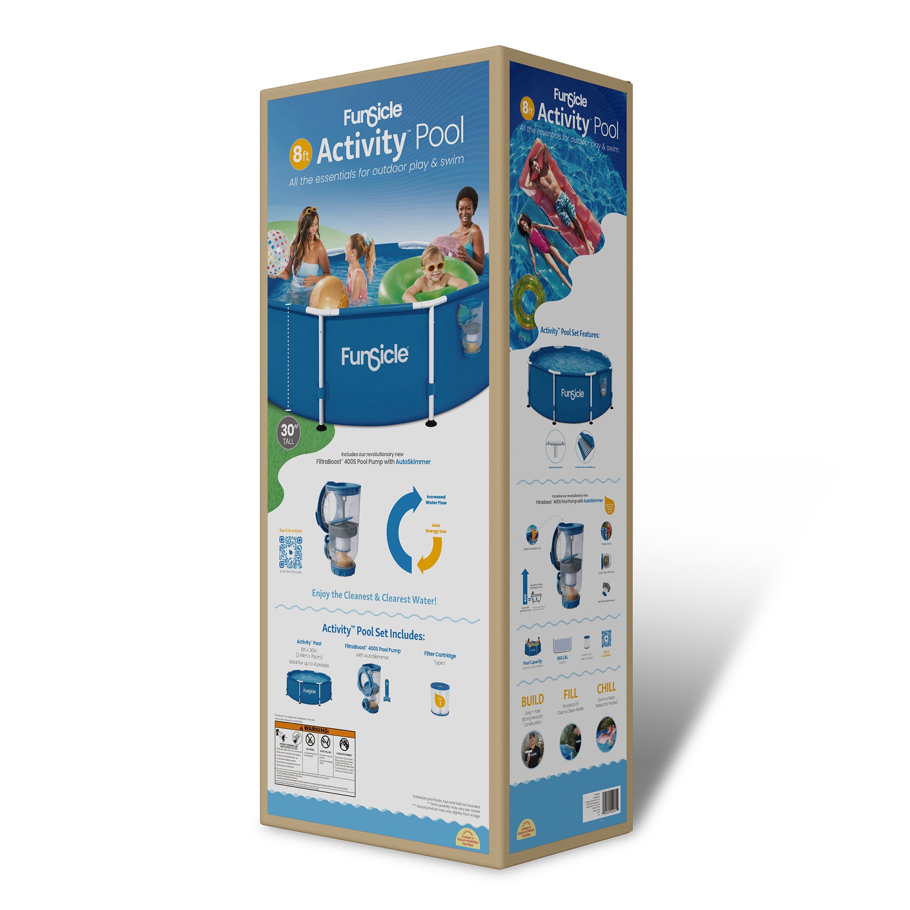 The Funsicle 8ft Activity Pool includes all the essentials for outdoor play and swim. You will appreciate its quick setup, enabling you to easily build, fill and chill. Setup is easier with the SmartConnect™ technology: Simply connect the poles together until there’s a “click”, and the frame will stand firmly in place. With space for up to 4 people, you can delight in everything from games to swimming. The sturdy metal structure and puncture-resistant material ensure a long-lasting pool to enjoy. The innovative Funsicle FiltraBoost™ 400S Pool Pump with AutoSkimmer and powerful flow rate helps maintain the pool's sparkling interior, keeping the water clean all day, every day. The filter pump conveniently attaches to the pool's side wall, keeping swimmers safe from tripping. The Funsicle 8ft Activity Pool is best for young families and outdoor enthusiasts who appreciate being active in a high-value above ground pool.