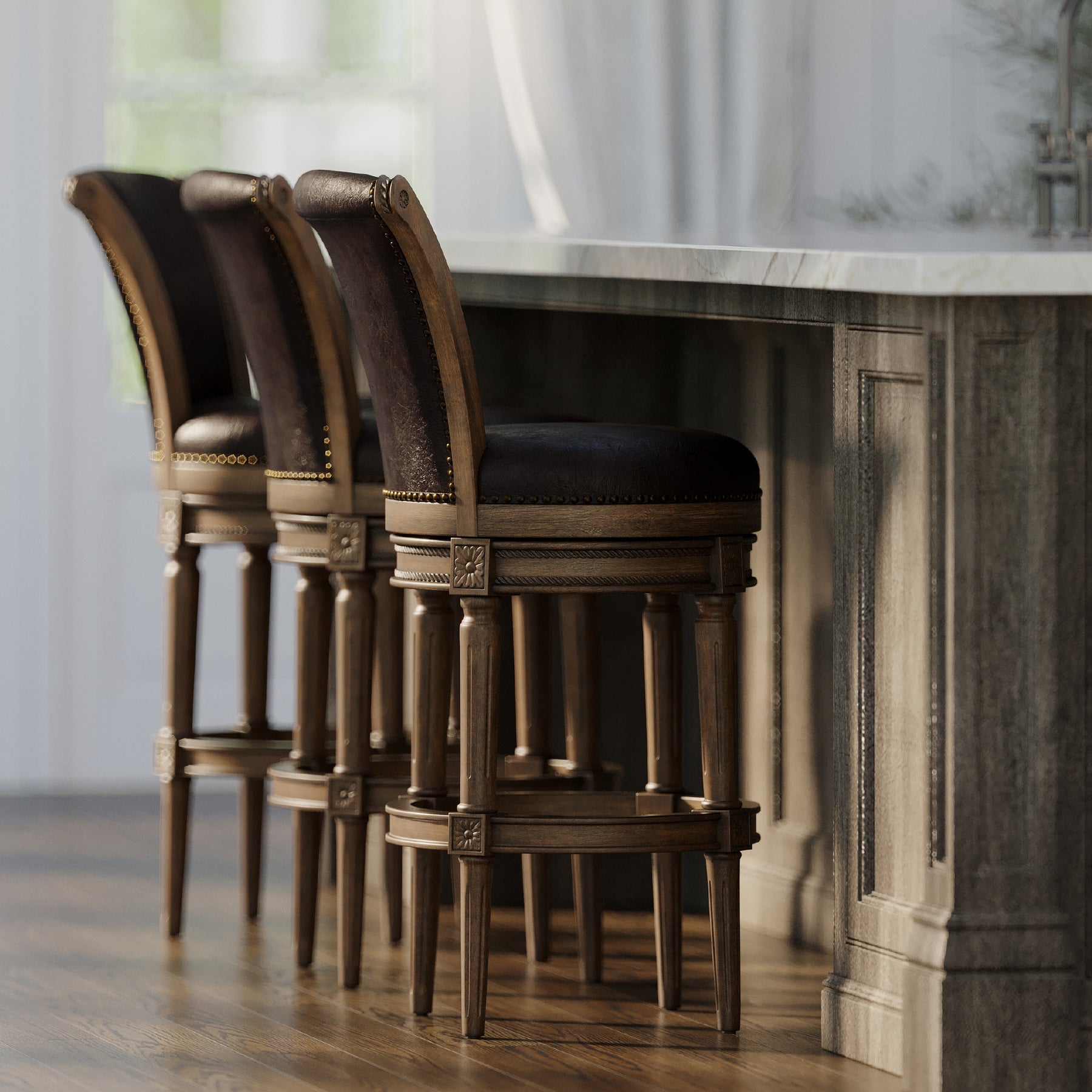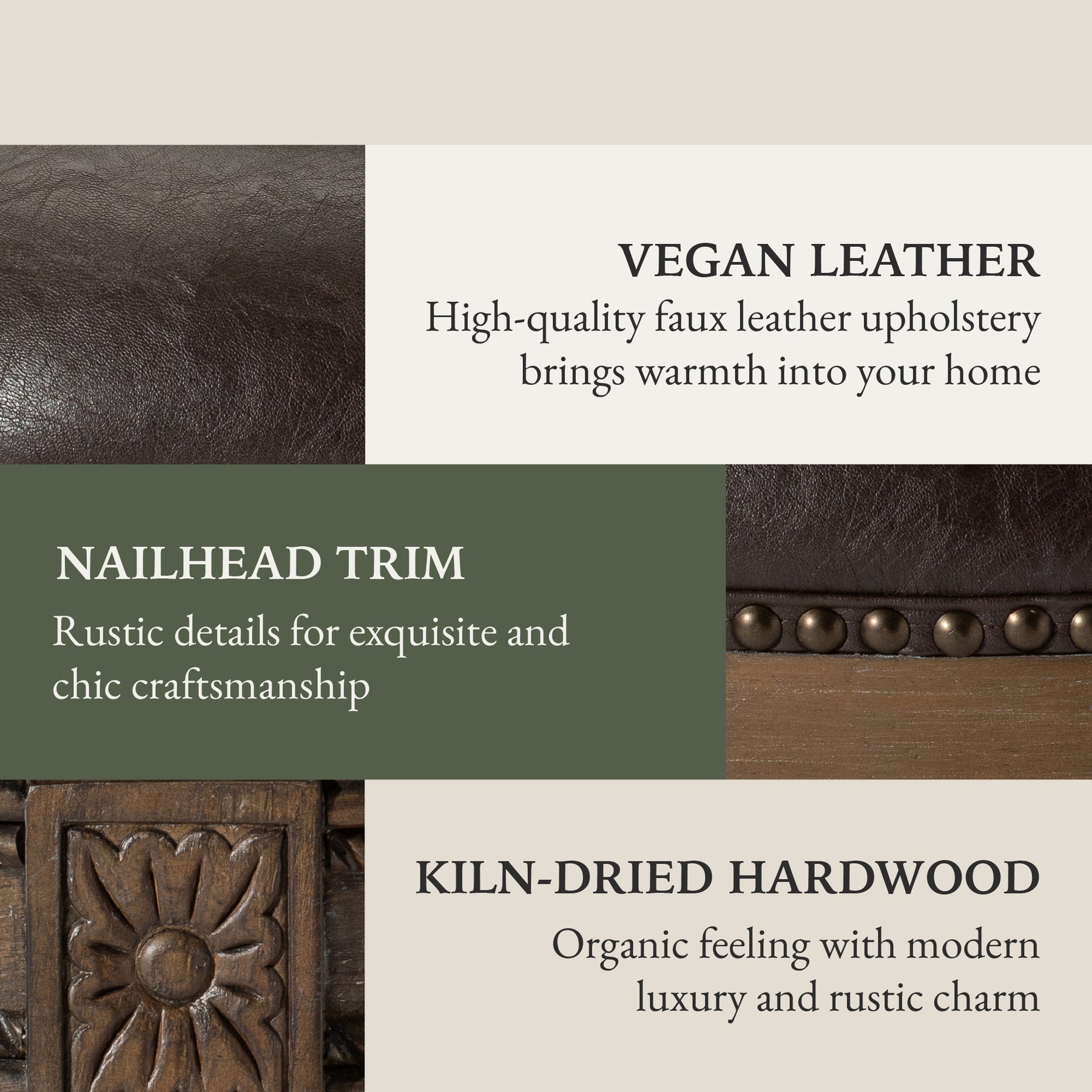• Hand-applied nail head trim, intricately carved details, and impeccable craftsmanship all come together to bring you premium form and function