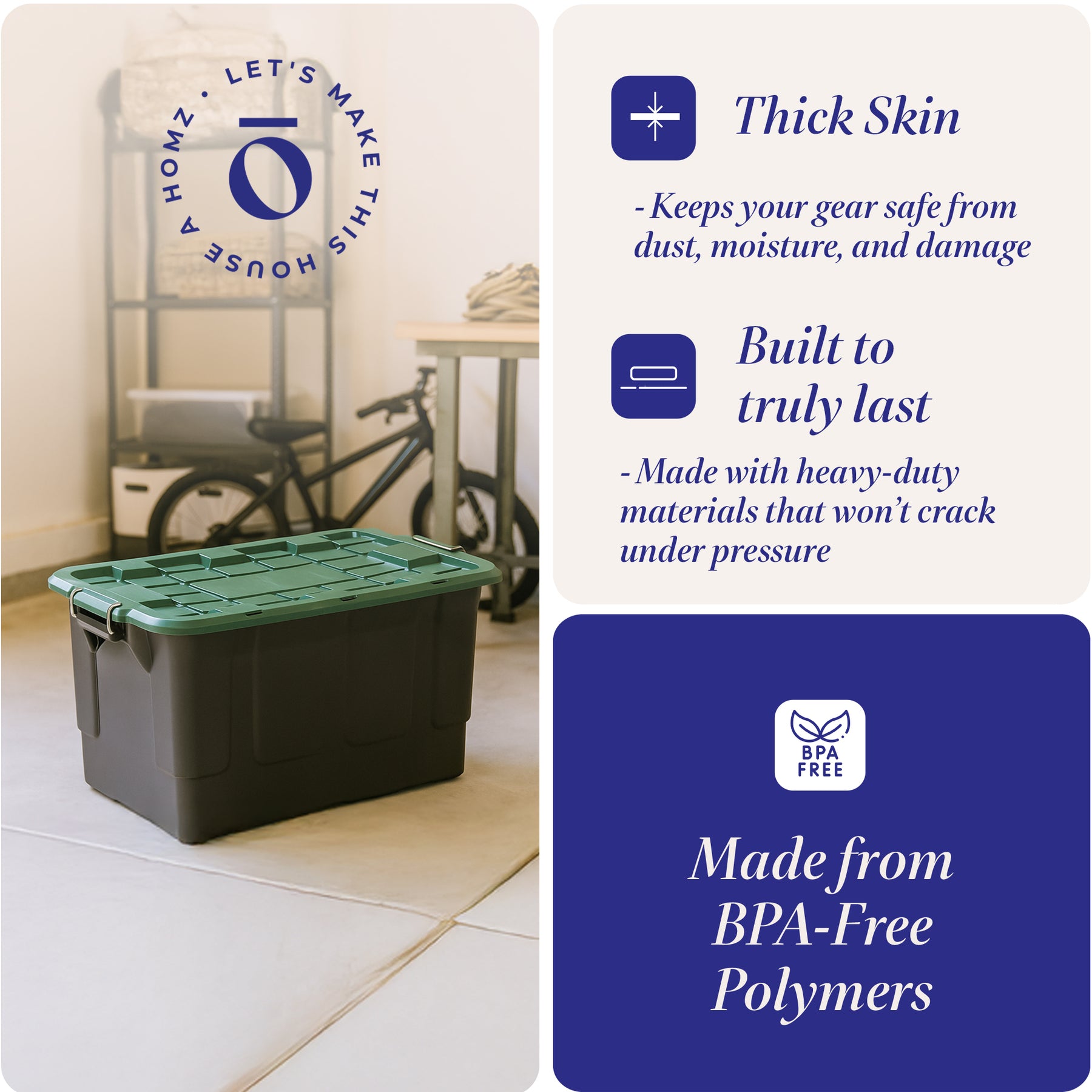 • Stackable bins can interlock to ensure the bins remain secure and provide a space-efficient storage solution in your garage, basement, or shed space