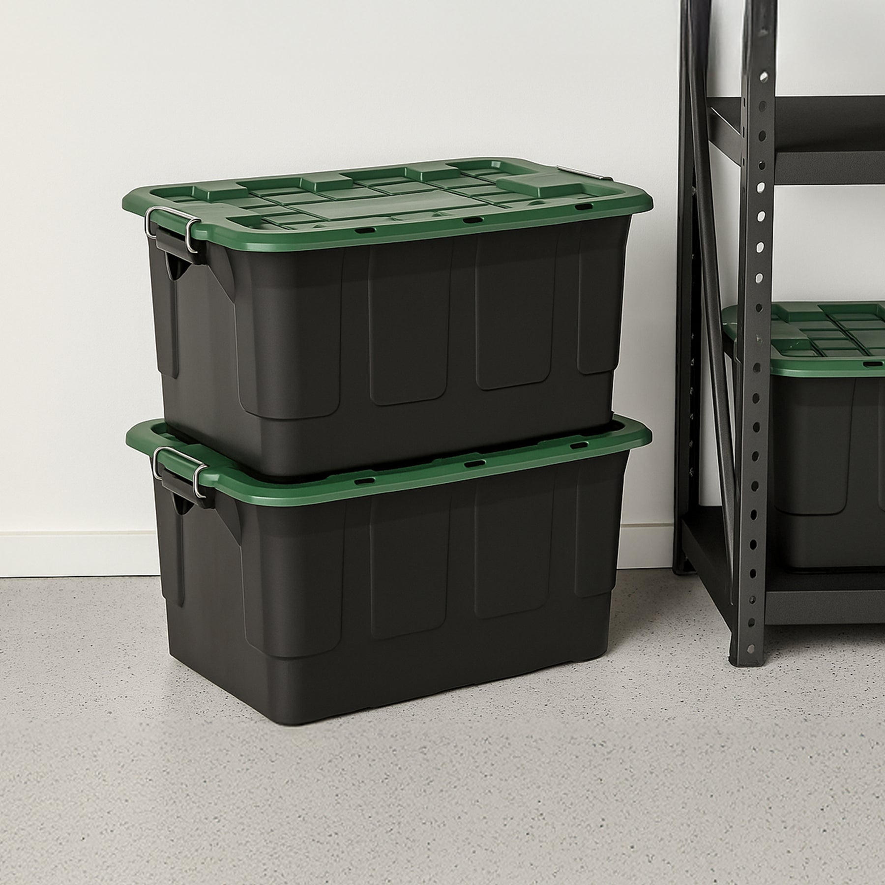 Homz 2 Pack 30-Gallon Plastic Stackable Home Storage Bins with Lids, Black/Green