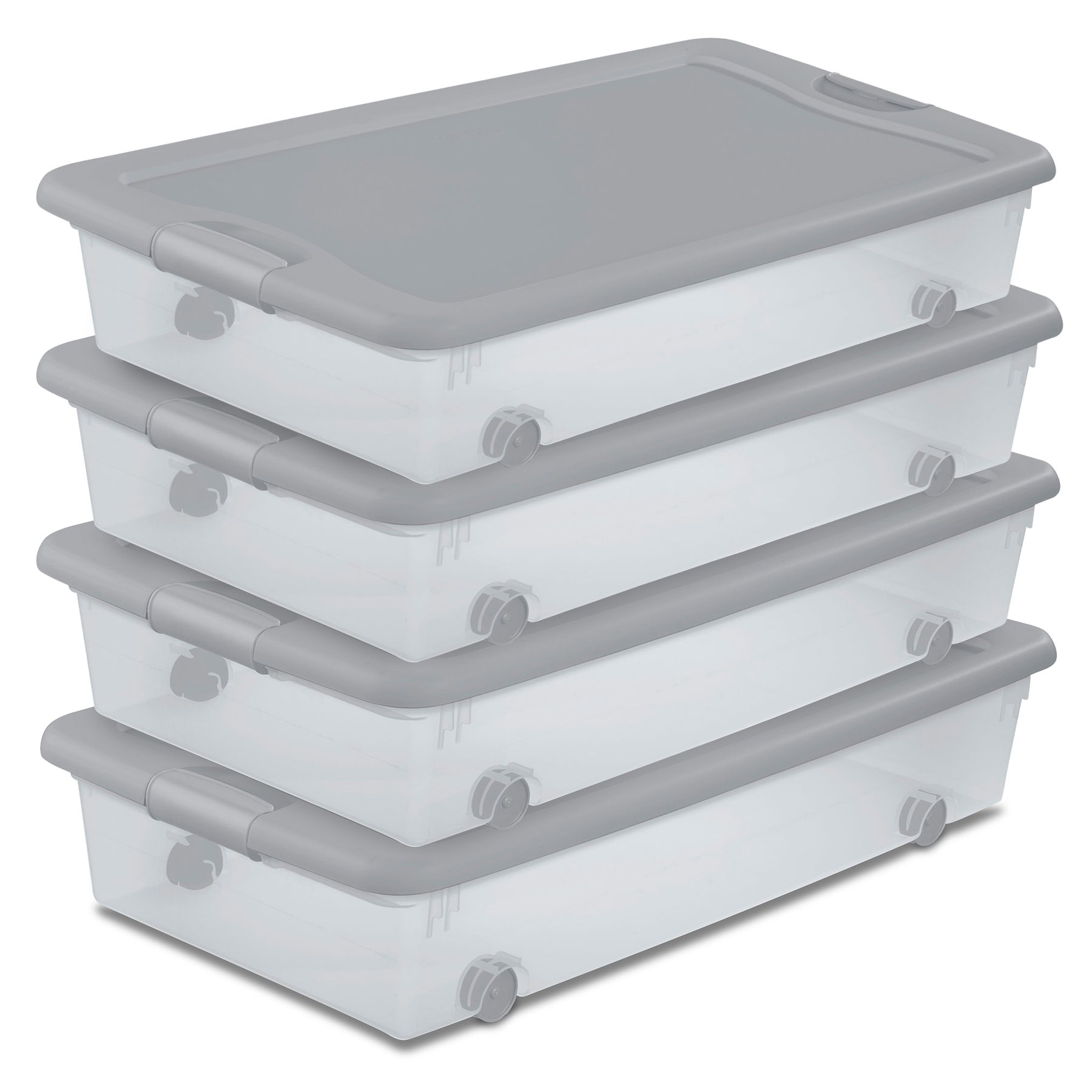 Sterilite 56 Qt Wheeled Under Bed Storage Container, Plastic Bin, Silver, 4 Pack