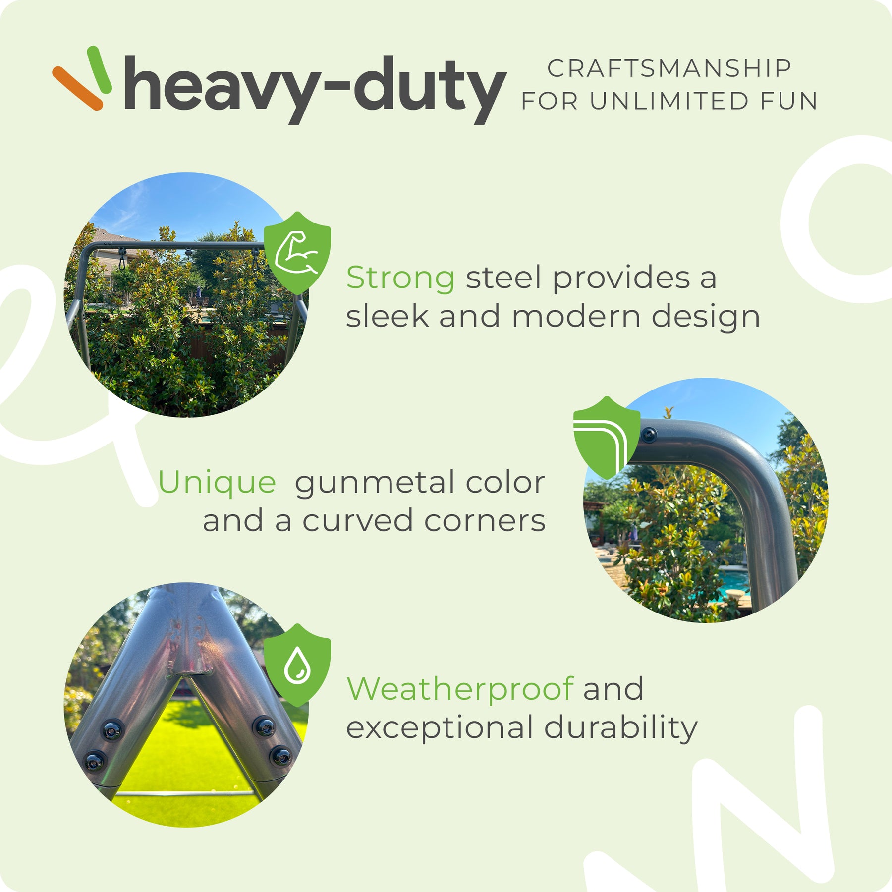With a sleek and modern design, this Swing Set Frame is sturdy and built for fun. Curved corners and a unique gunmetal color seamlessly blend with landscaping and upgrade the visual appeal of your outdoor space. Designed to exceed your expectations, this single swing frame delivers fun while ensuring it offers quality, versatility, and aesthetics. Guaranteed not to bend or warp, its robust design features a support bar and wide frame. It provides optimal stability and strength for hours of secure and enjoyable swinging.