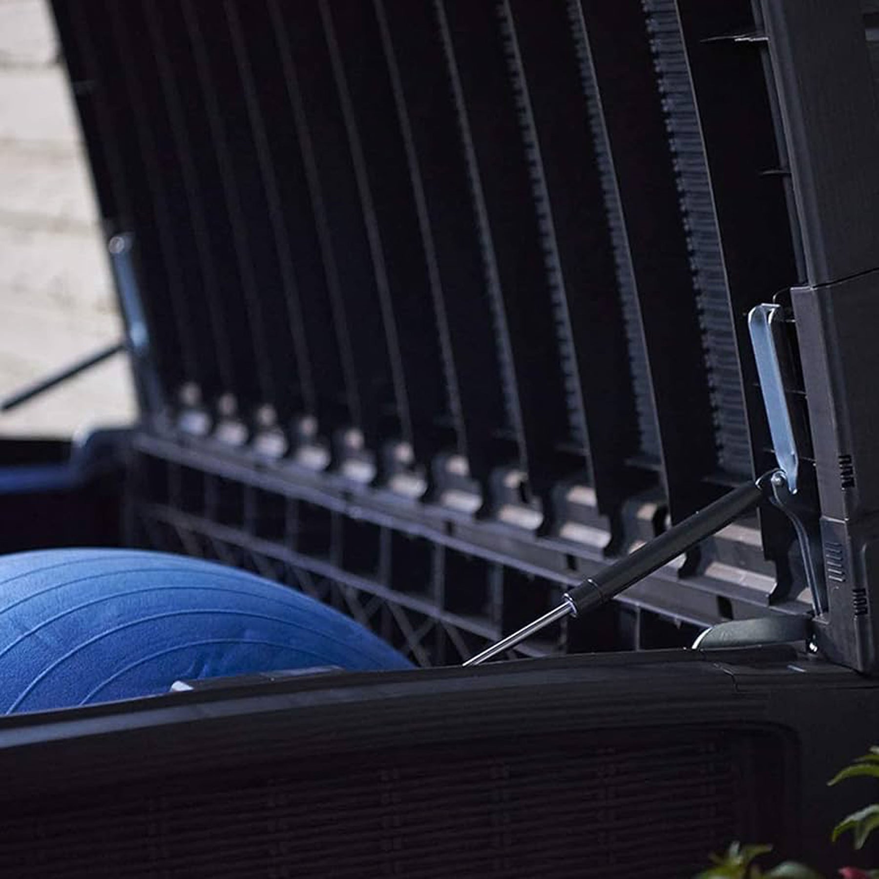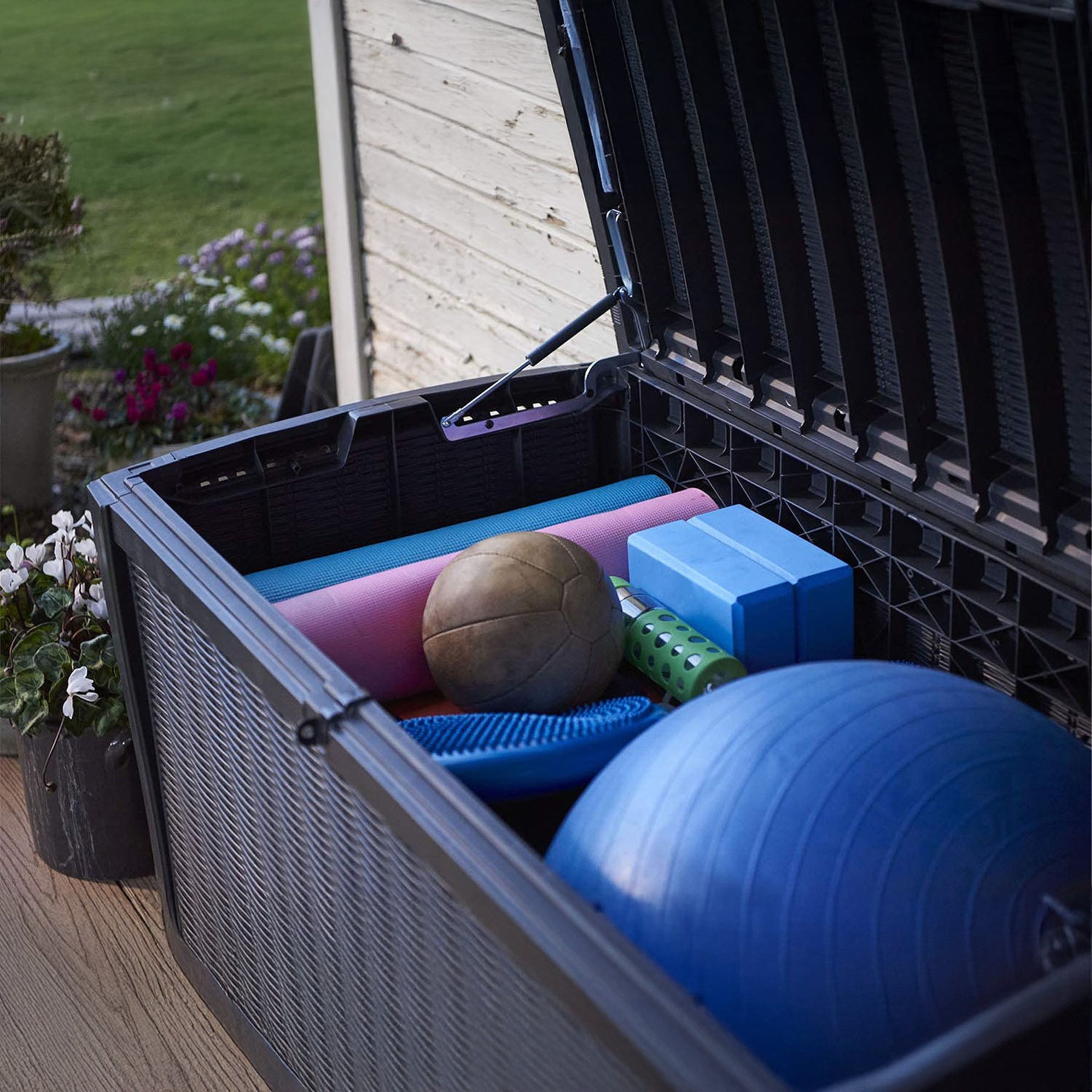 • 110-gallon outdoor storage box built to store patio accessories, garden cushions, pool toys, and tools