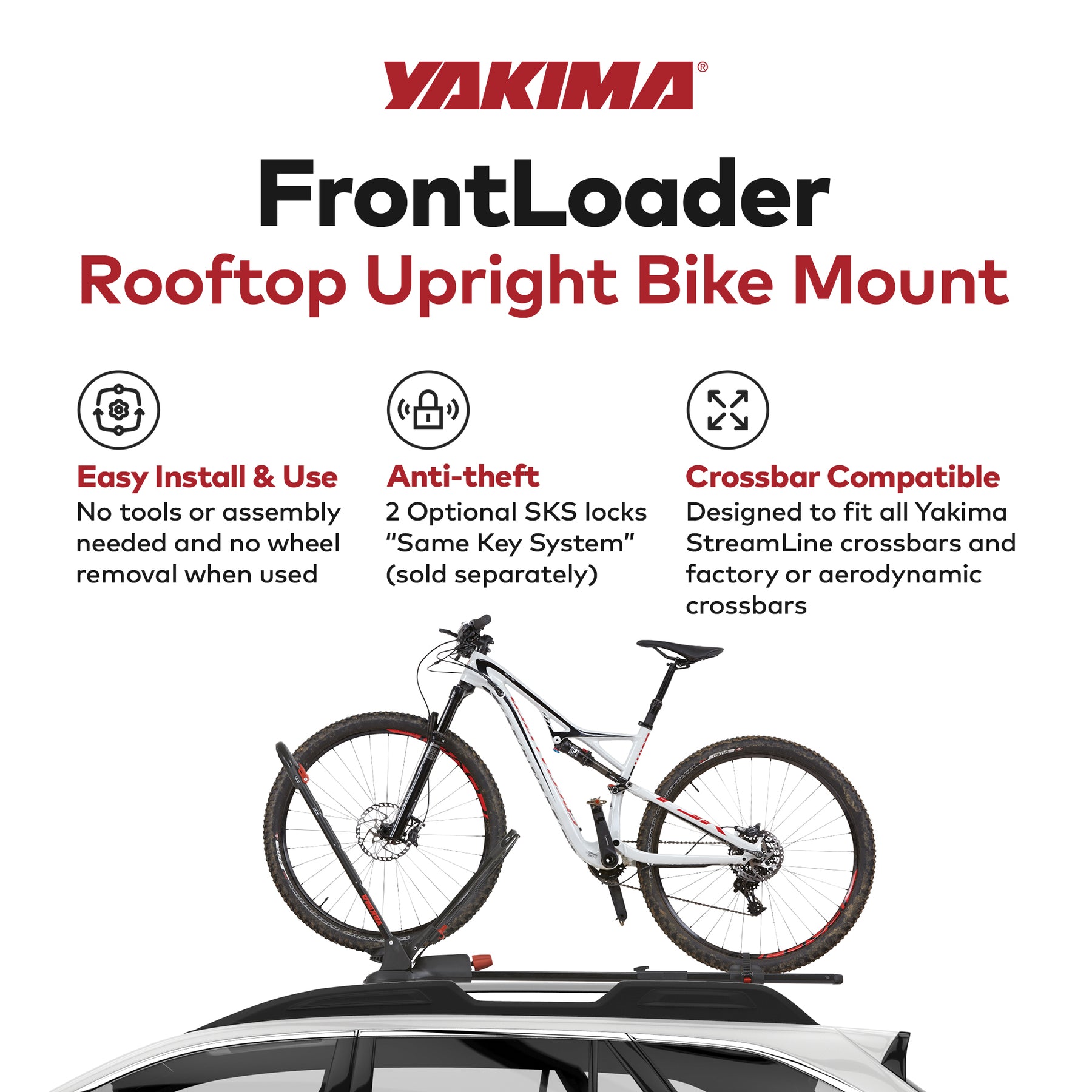 • Rooftop-mounted bike rack that loads quickly and carries 1 bike compatible with Yakima StreamLine crossbars, factory crossbars, and aerodynamic crossbars