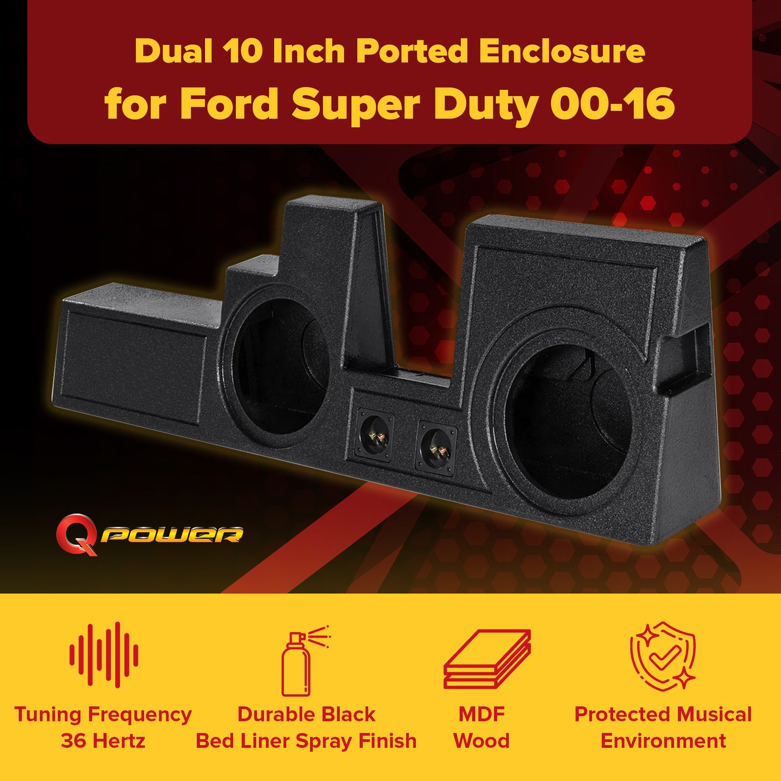 What's better than an awesome subwoofer enclosure in your Ford Super Duty? Nothing. This Q Power Dual 10 Inch Ported Enclosure gives your truck a pep in its step and securely houses your subwoofers.