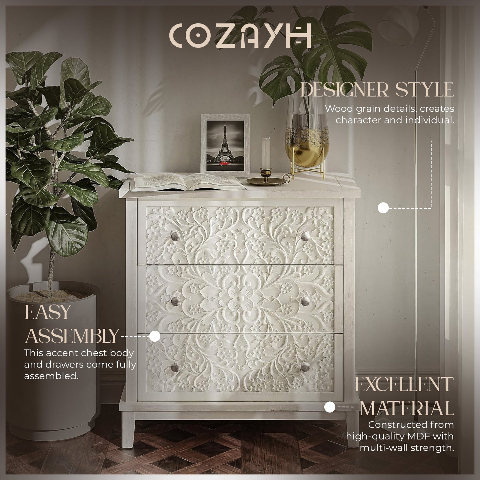 COZAYH 3-Drawer Flower Motif Dresser for Home & Bedroom, Fully Assembled, White