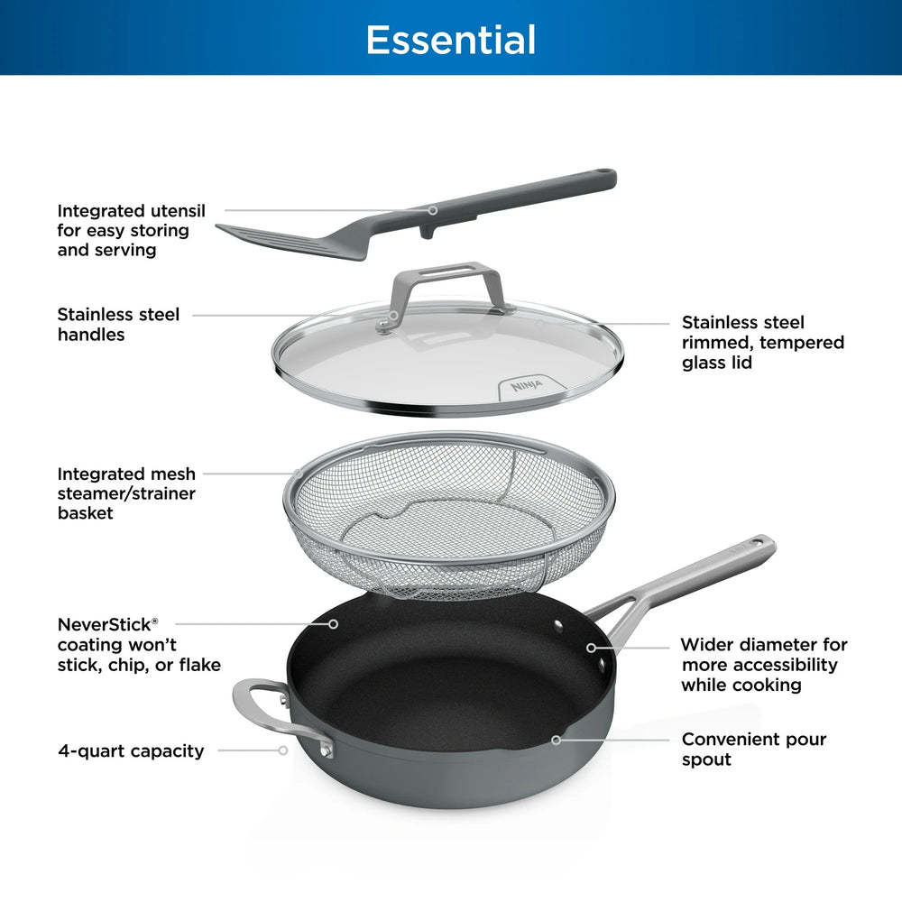 Ninja NeverStick 4qt Pan w/Lid & Strainer, Oven Safe, Sea Salt Grey (Open Box)