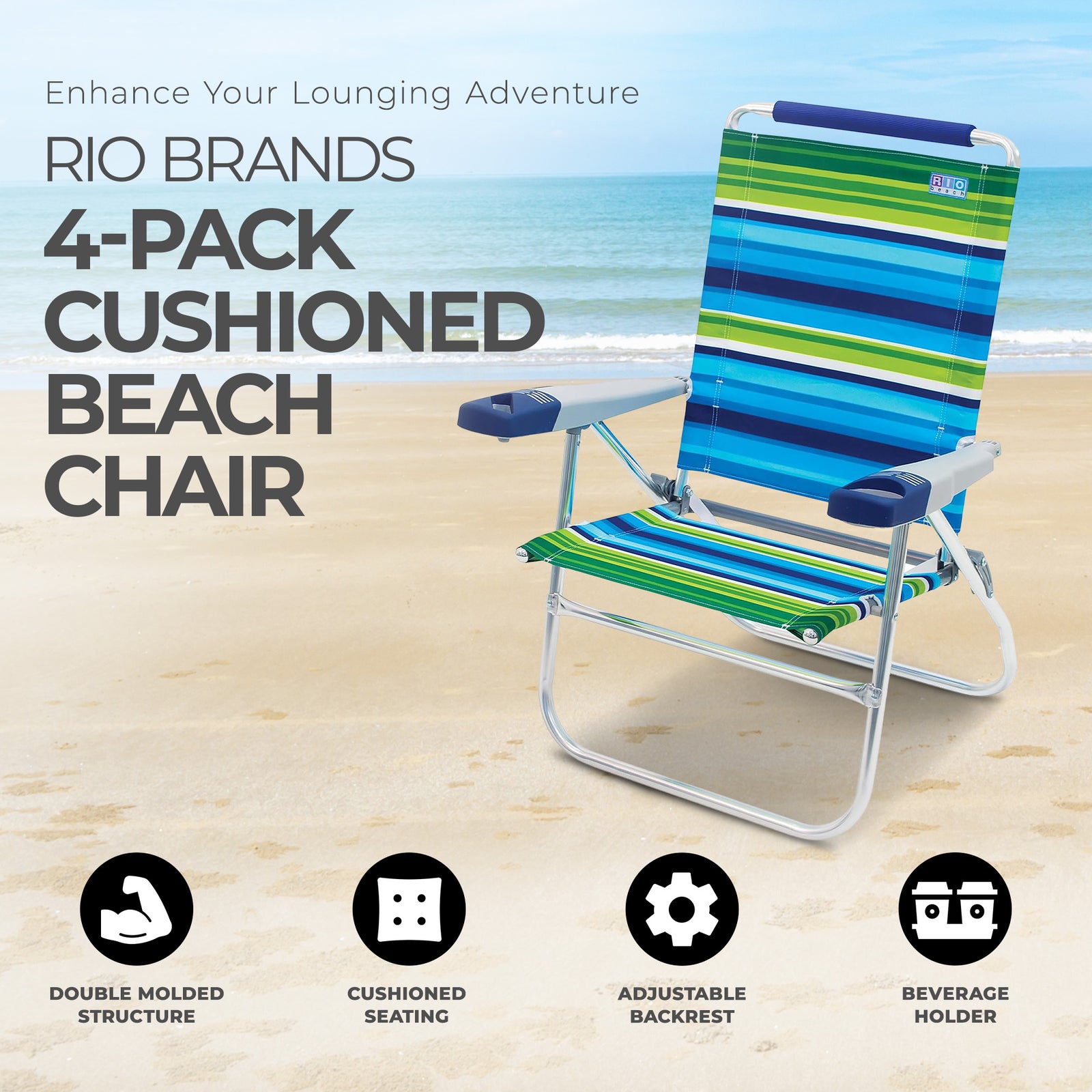 RIO Brands 15 Inch Cushioned Beach Chair w/Aluminum Frame, Blue/Green (4 Pack)