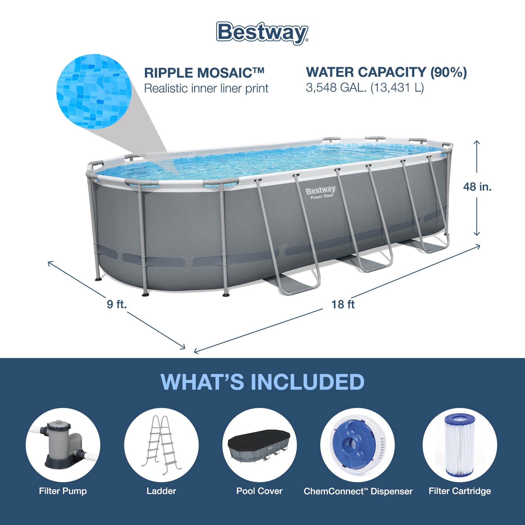 • Includes a 1,500 GPH filter pump, a ladder, and a convenient secure pool cover