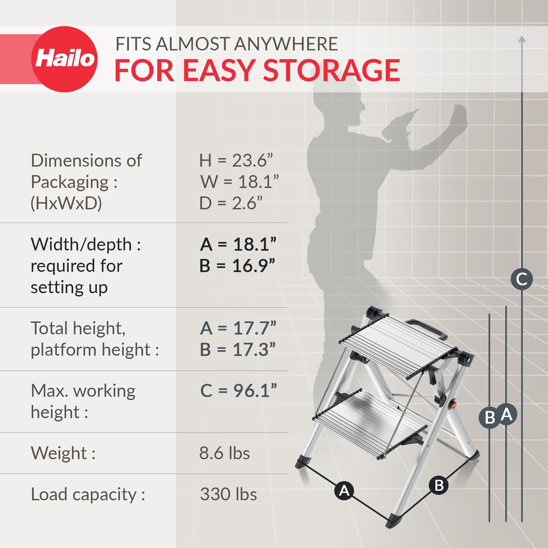 • Ladder can be stored in a closet or behind a door without taking up much space, as it is about 2.6 inches wide when folded