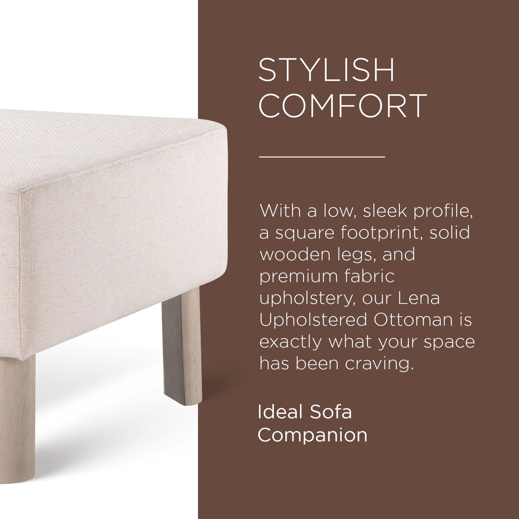 • Lena Upholstered Ottoman features a low, sleek profile, a square footprint, solid wooden legs, and premium fabric upholstery, ideal for any home space