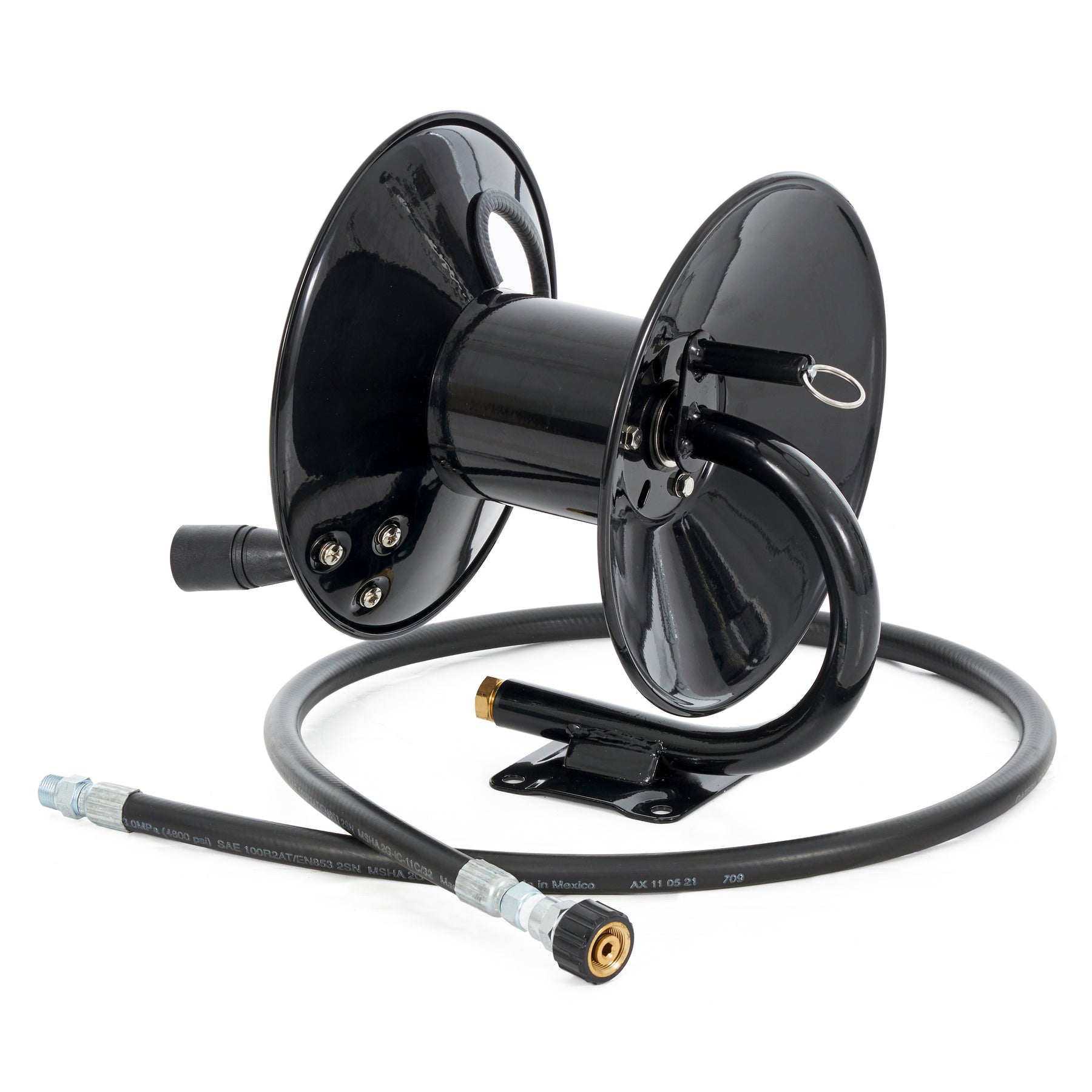 • Steel pressure washer hose reel allows you to keep your hose well-organized, reeling in your hose into a compact area