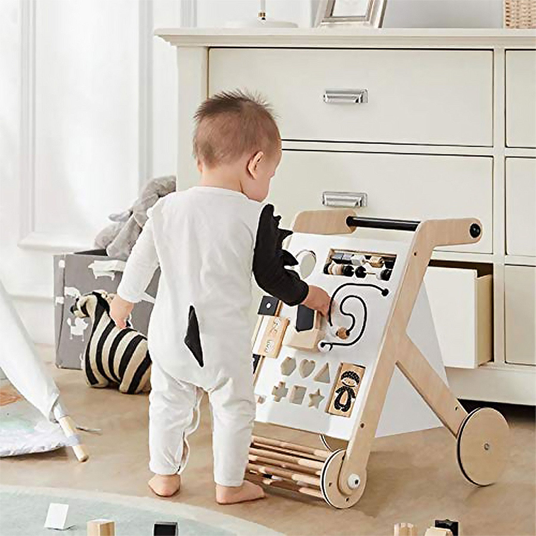 • A push and pull walker that includes 6 shapes, cell phone and holder, 5 counting flaps, a mirror, bead maze, and abacus