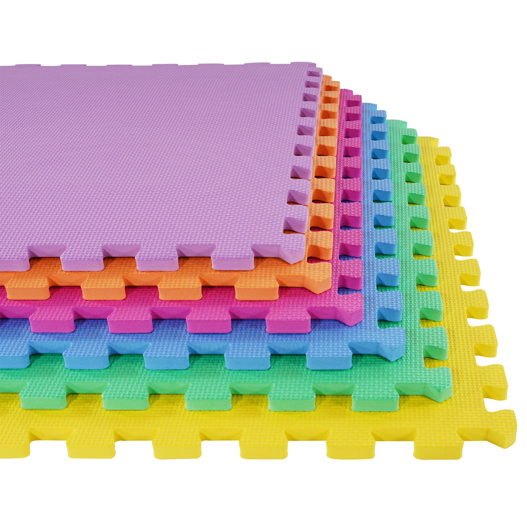 • Floor mat with (12) 24 x 24-inch foam exercise tiles with interlocking edges and 48 end borders for 48 square feet of durable support in your home, gym, or daycare