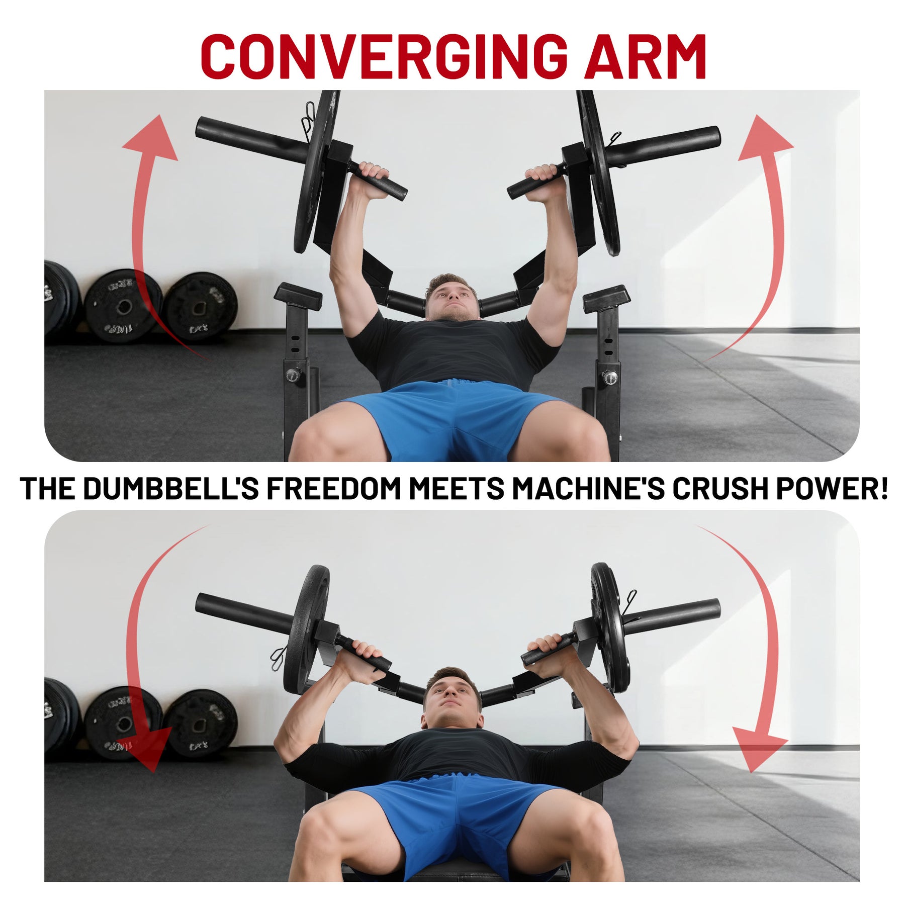 - Converging arm design mimics natural pressing motion, combining dumbbell freedom with machine stability
