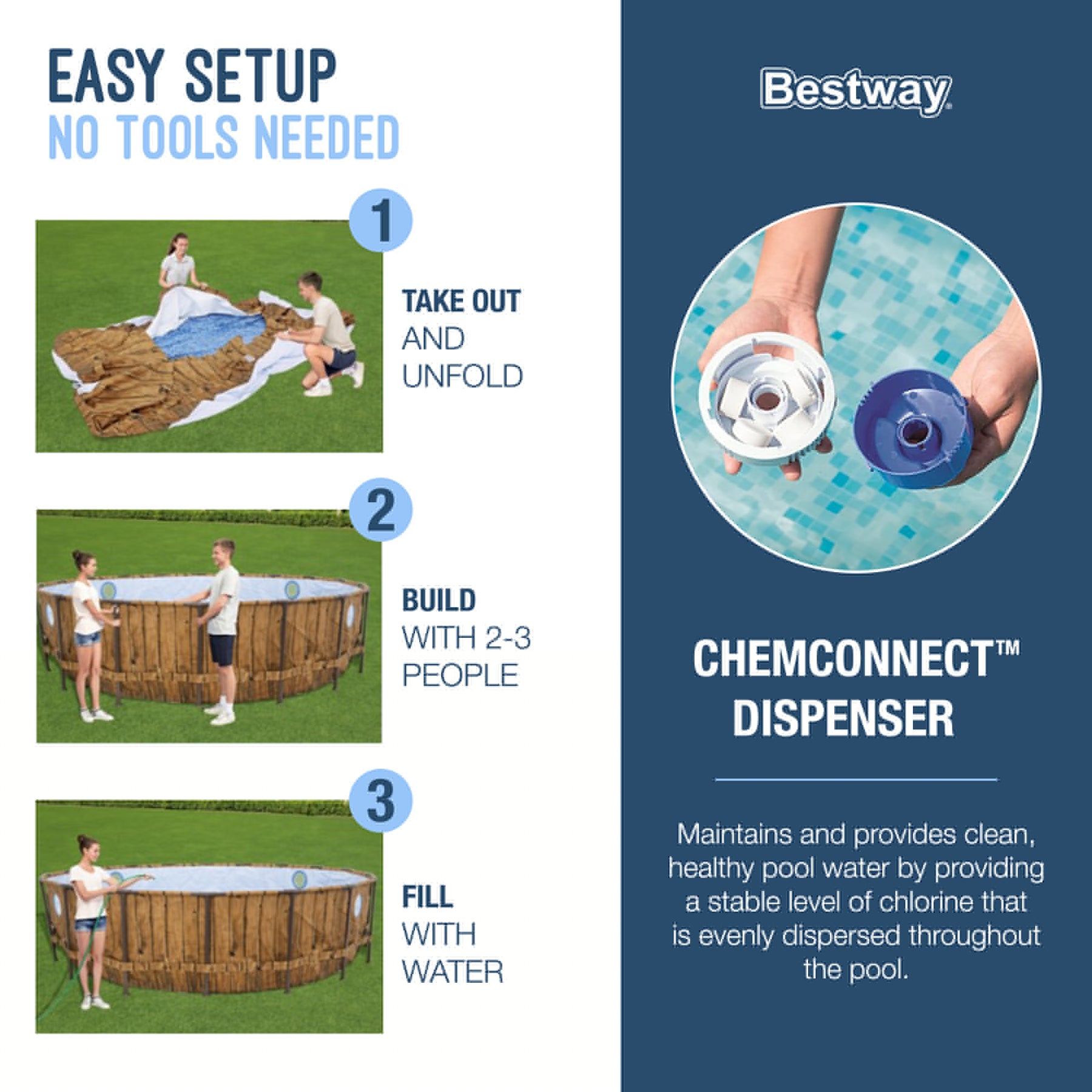 • Includes filter, cover, ladder, garden hose drain adaptor, and Chemconnect dispenser