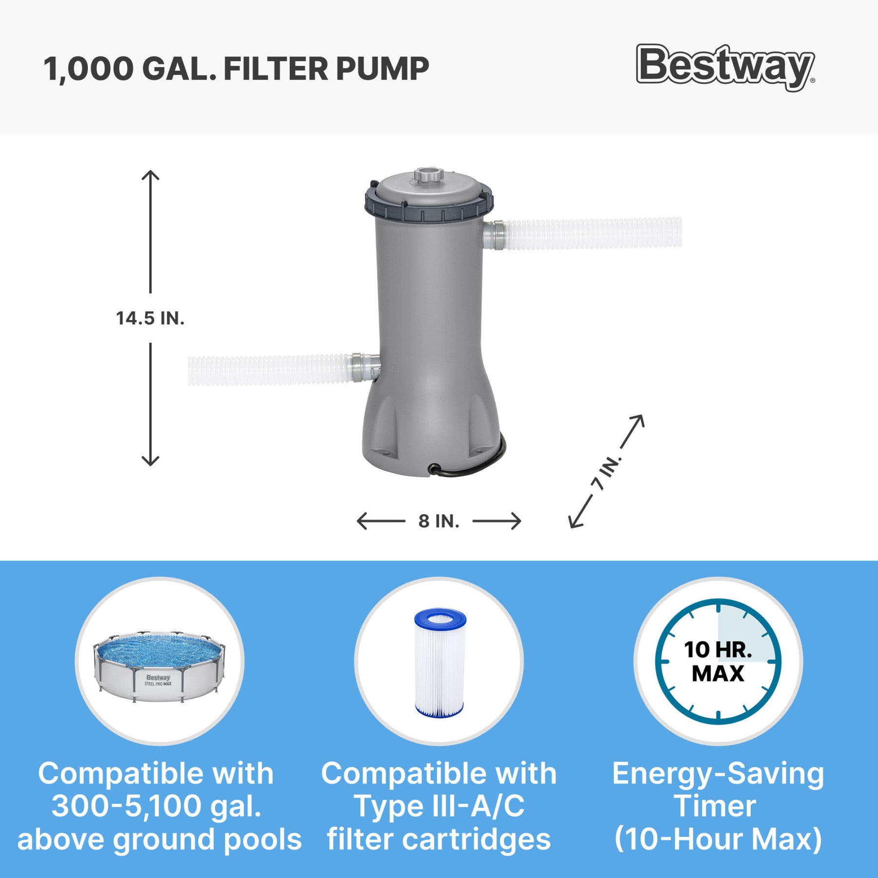 • Includes a 1,000-gallon filter pump, a ladder, and a convenient pool cover