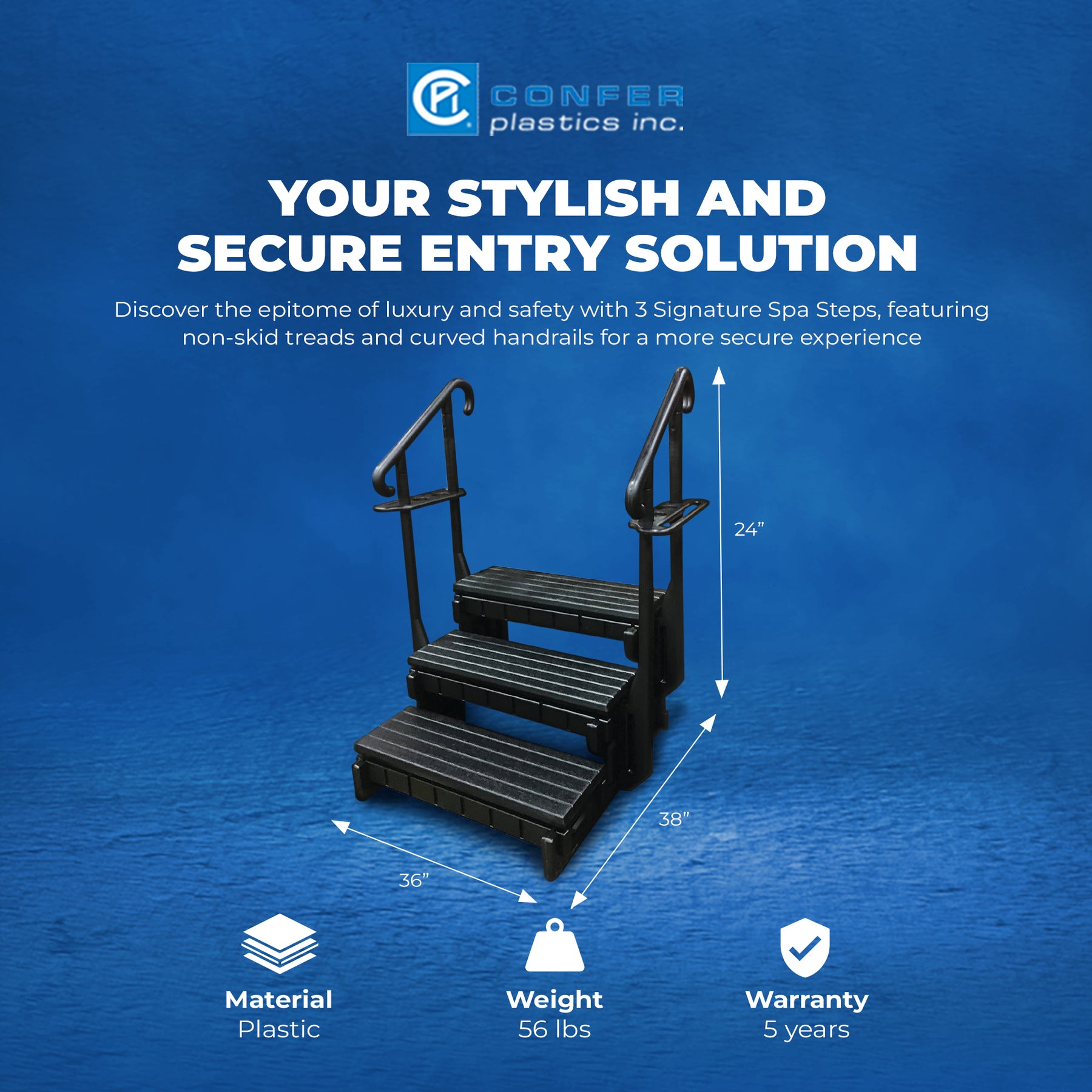 • Crafted by Confer Plastics, a leader in extrusion and roto molding, these spa steps feature double-thickness frames, sun ray protection, and shock resistance for a lifetime of durability