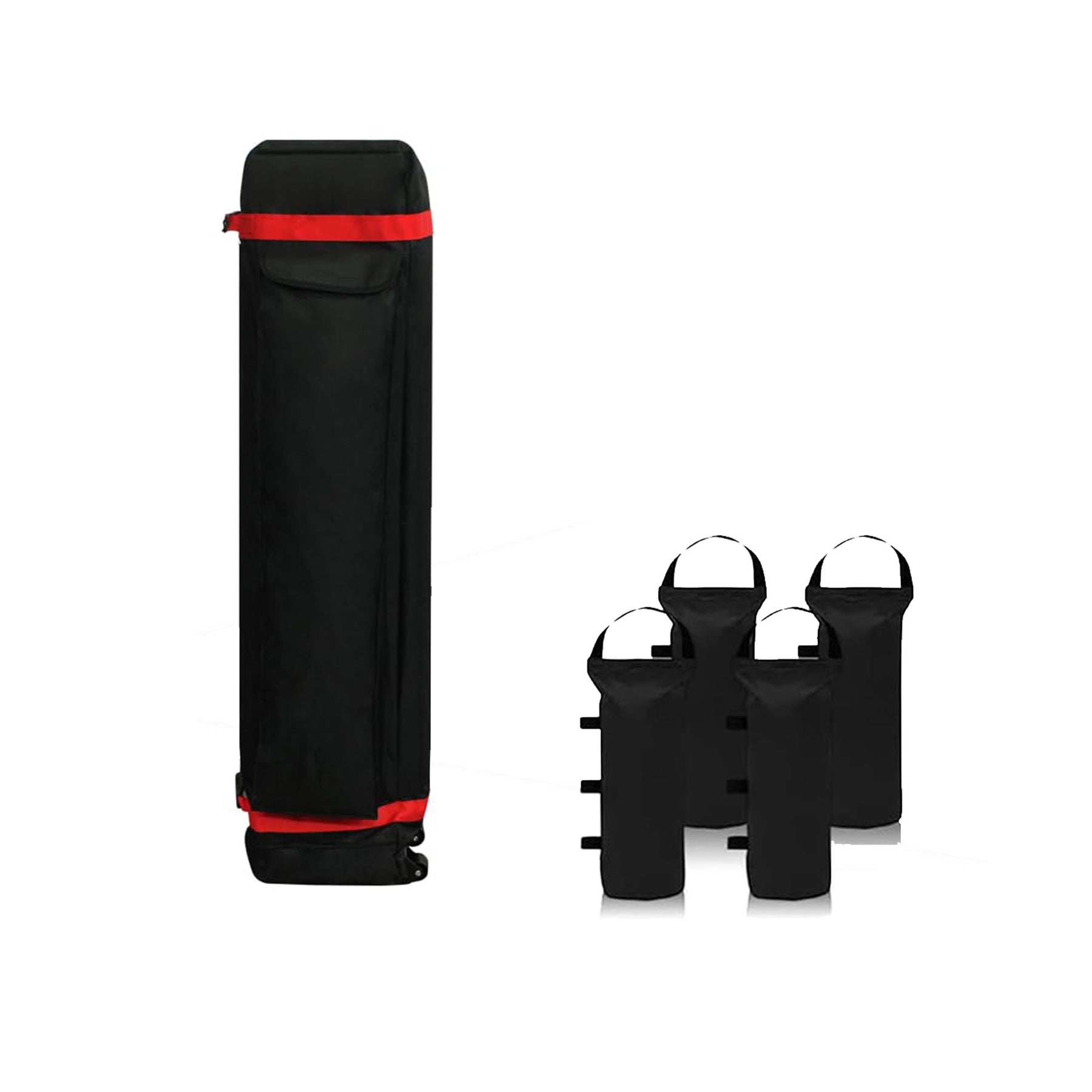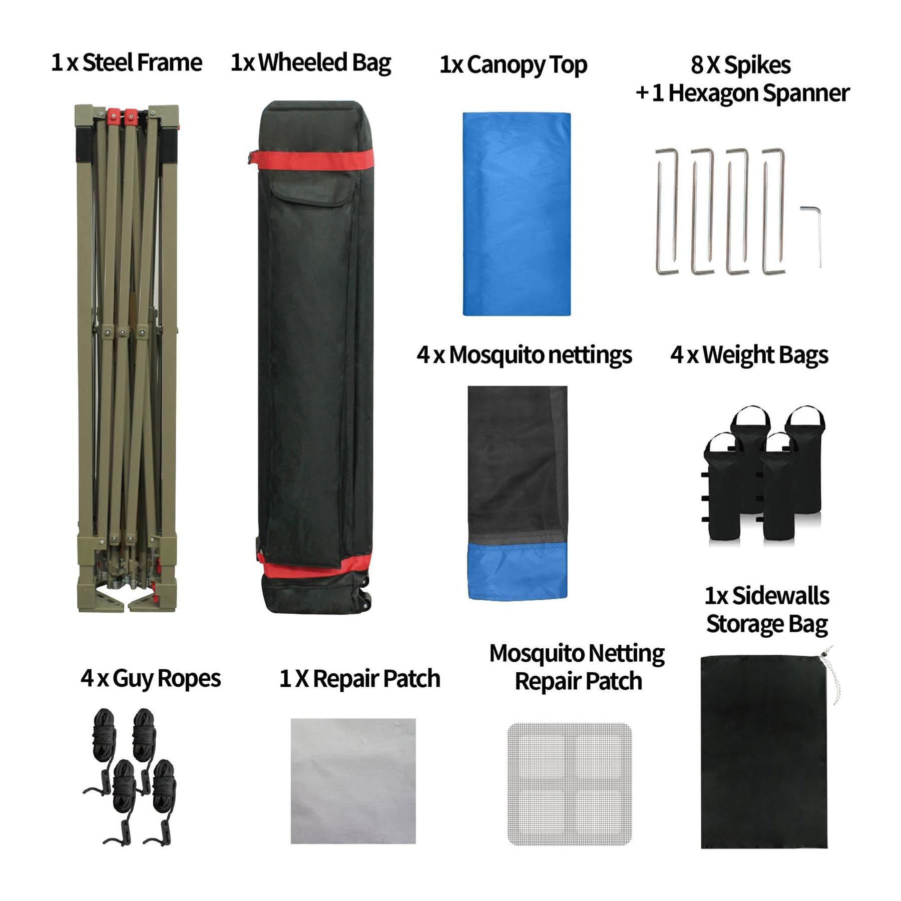 - Package includes frame, canopy top, small gazebo top fabric, 4 mosquito nets, wheeled cover bag, repair patch, 4 guy ropes, 4 empty sandbags, 8 spikes, and 1 hexagon spanner