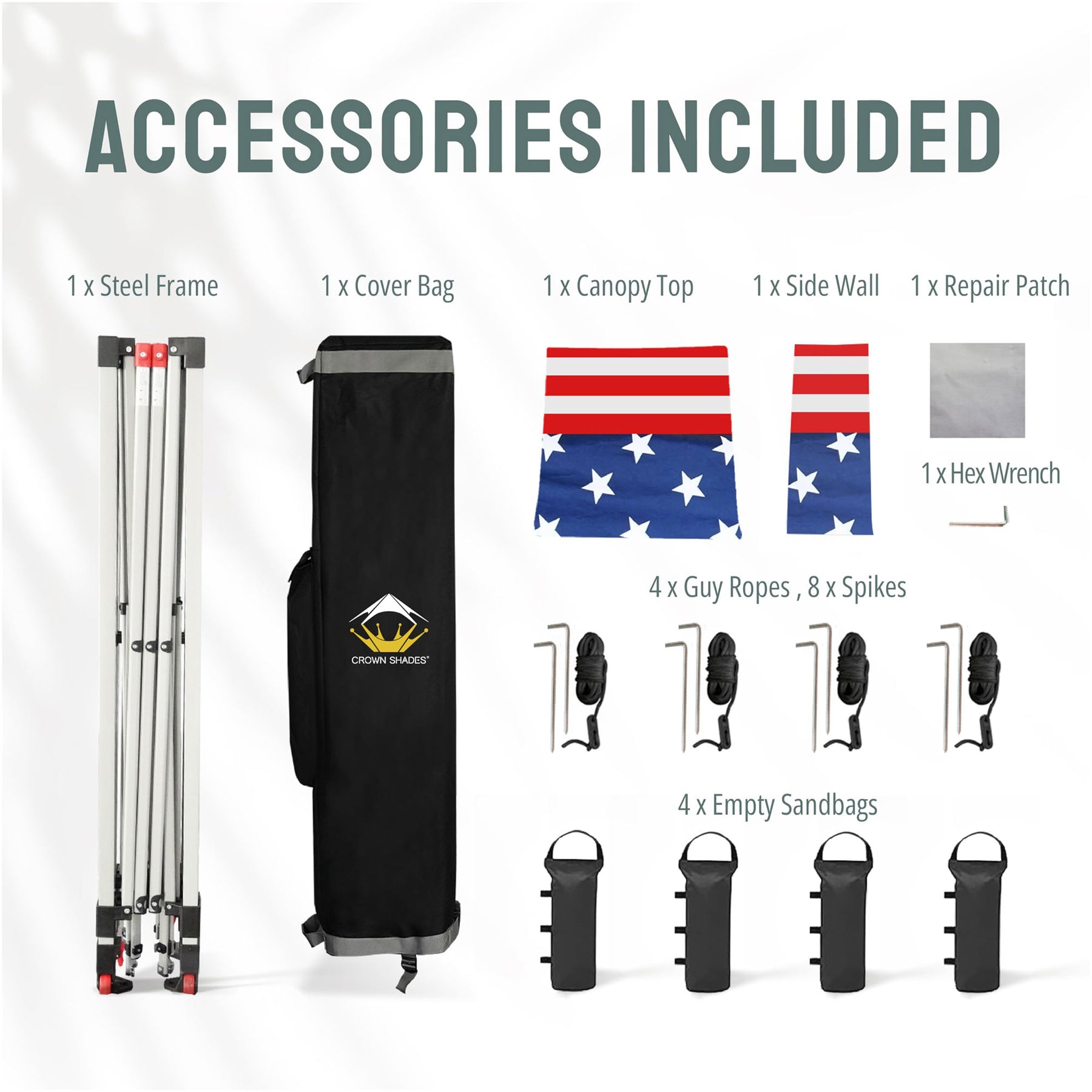 - Package includes frame, canopy top, sidewall, wheeled cover bag, repair patch, 4 guy ropes, 4 empty sandbags, 8 spikes, and 1 hexagon spanner