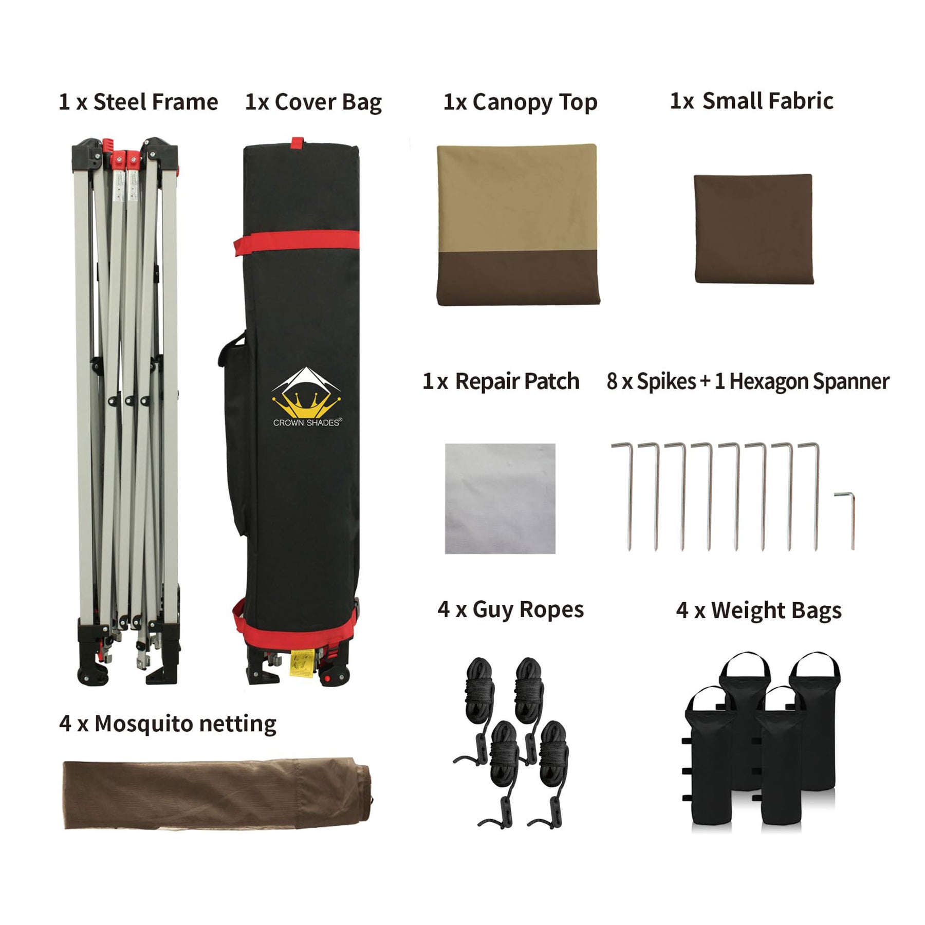 • Package includes frame, canopy top, small gazebo top fabric, 4 mosquito nets, wheeled cover bag, repair patch, 4 guy ropes, 4 empty sandbags, 8 spikes, and 1 hexagon spanner