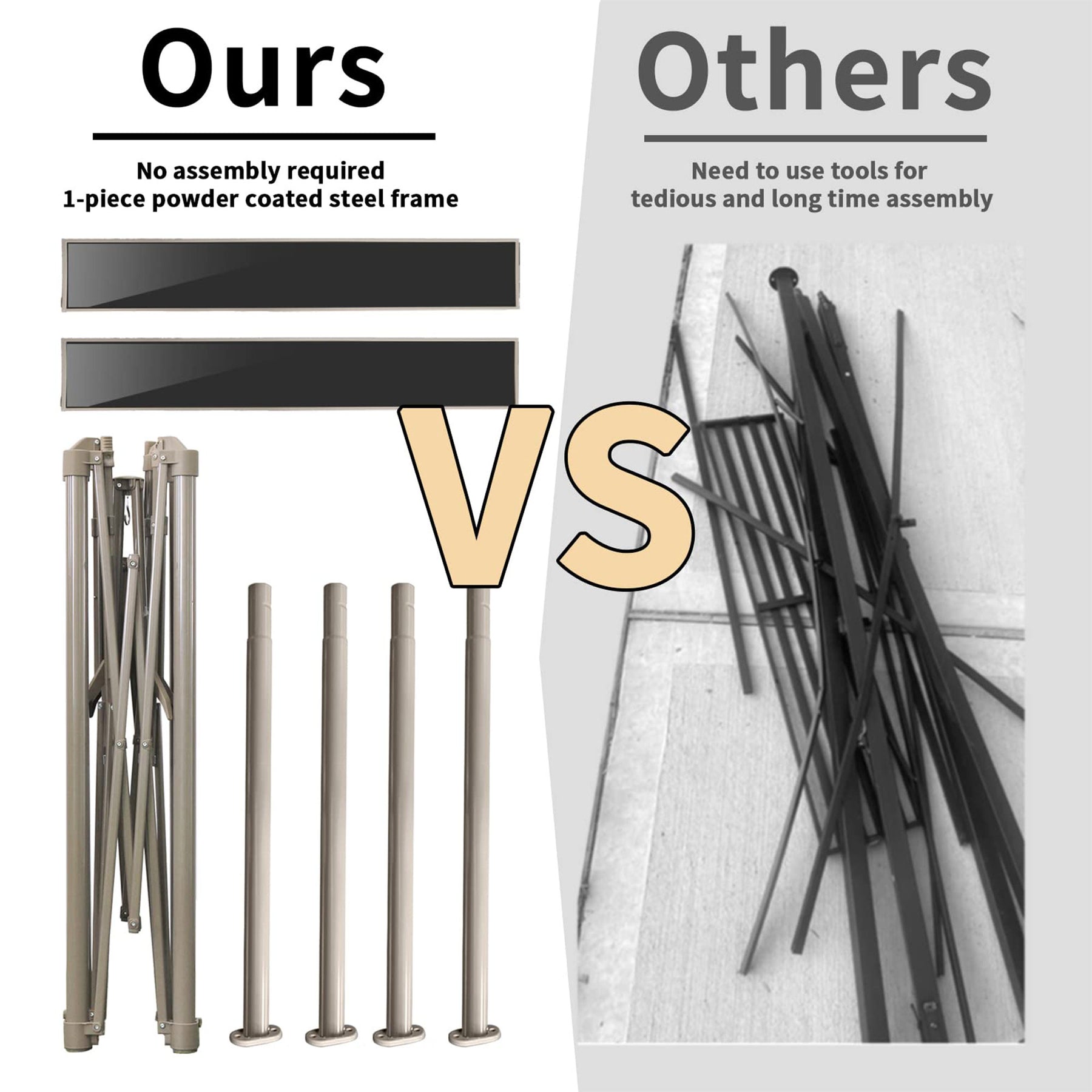 • Set up in less than 5 minutes with pre-assembled frames and patented 4-leg button locking system, no tools required; Knobs included for adjusting the frame height