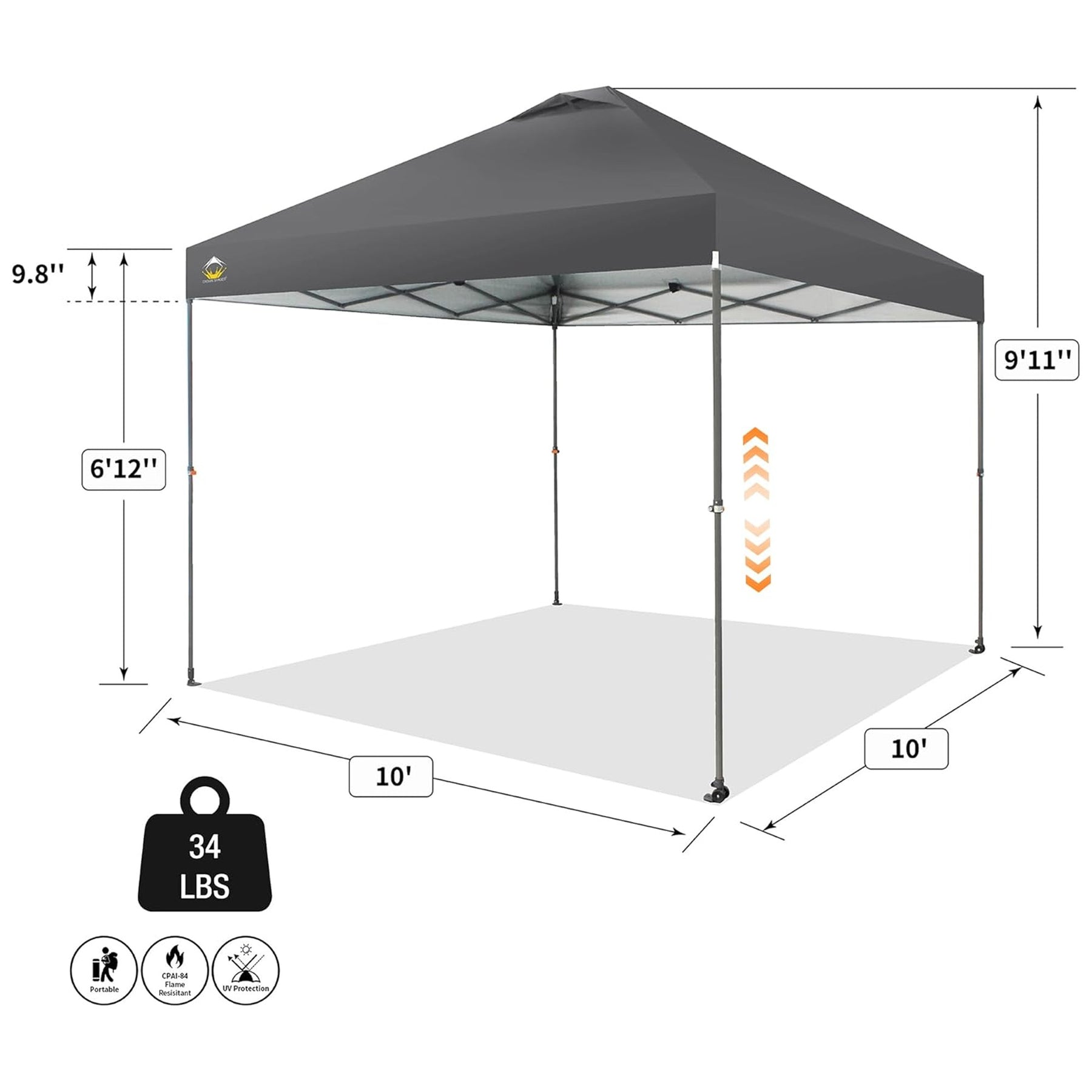 • 10x10-foot pop-up canopy tent features patented one-push center lock tech that locks the poles in place for simple setup