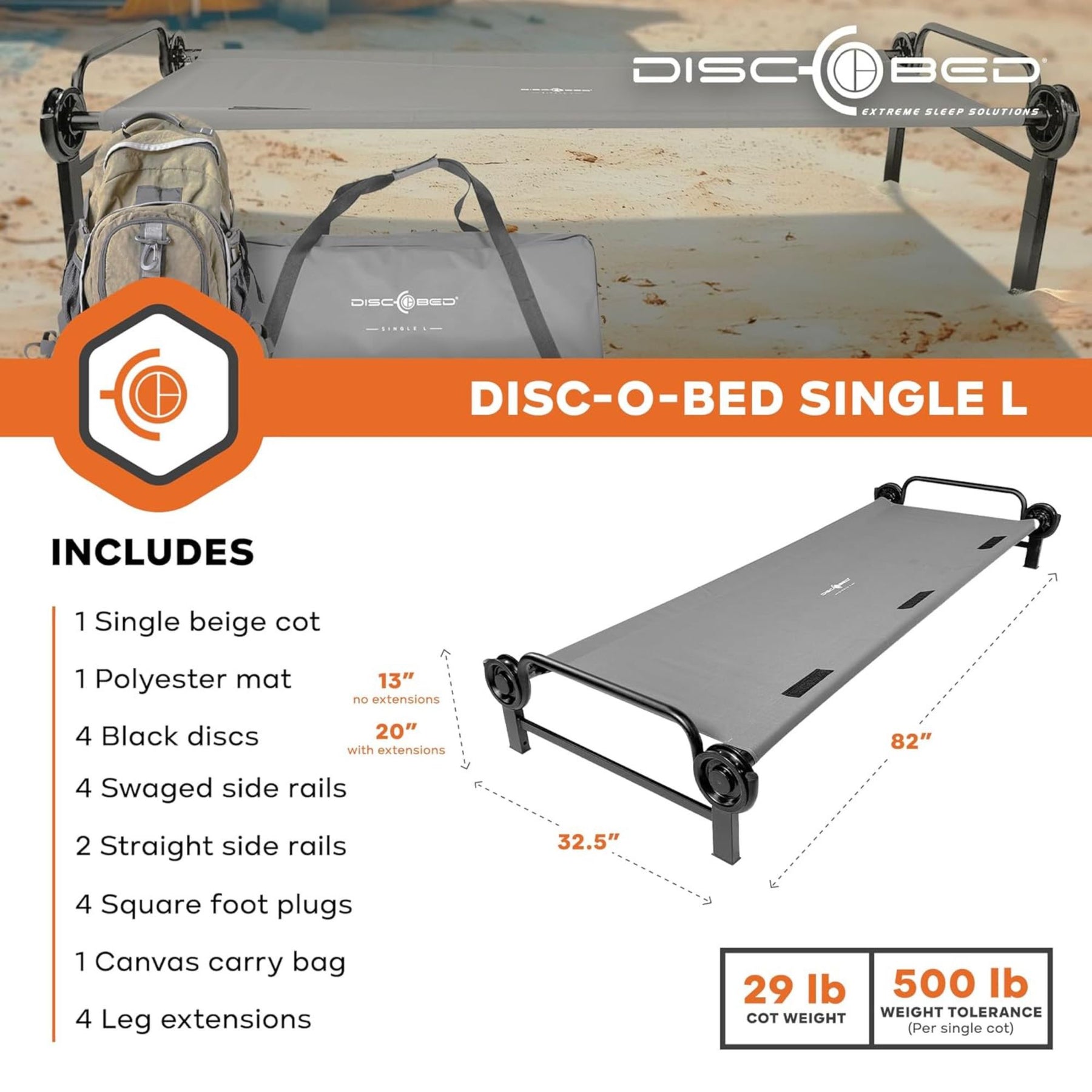 Disc-O-Bed Single Cot, Portable Sleep Solution for Tents, Grey, Large (Open Box)