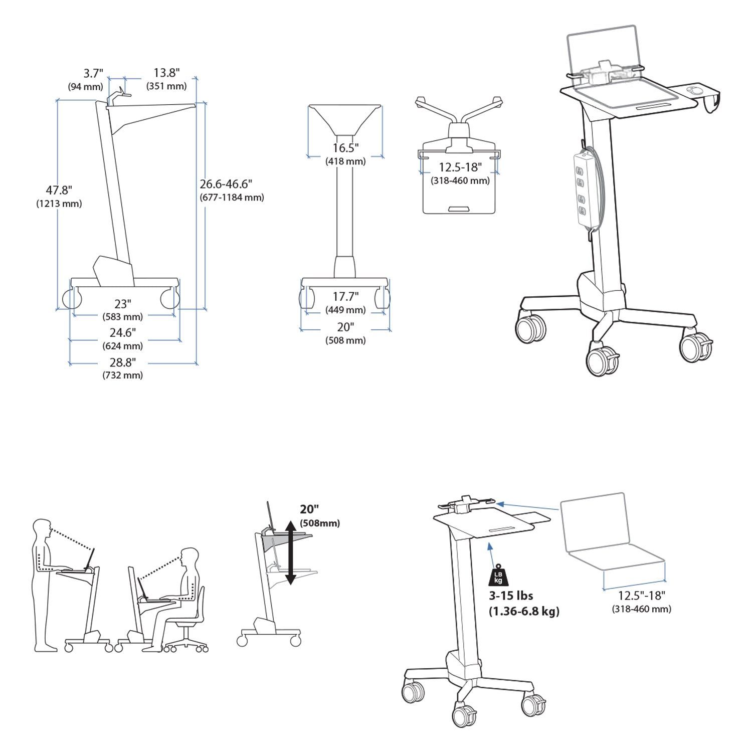 • Work sitting or standing with the ergonomic 20-inch (51 cm) height adjustment range on this adjustable laptop stand