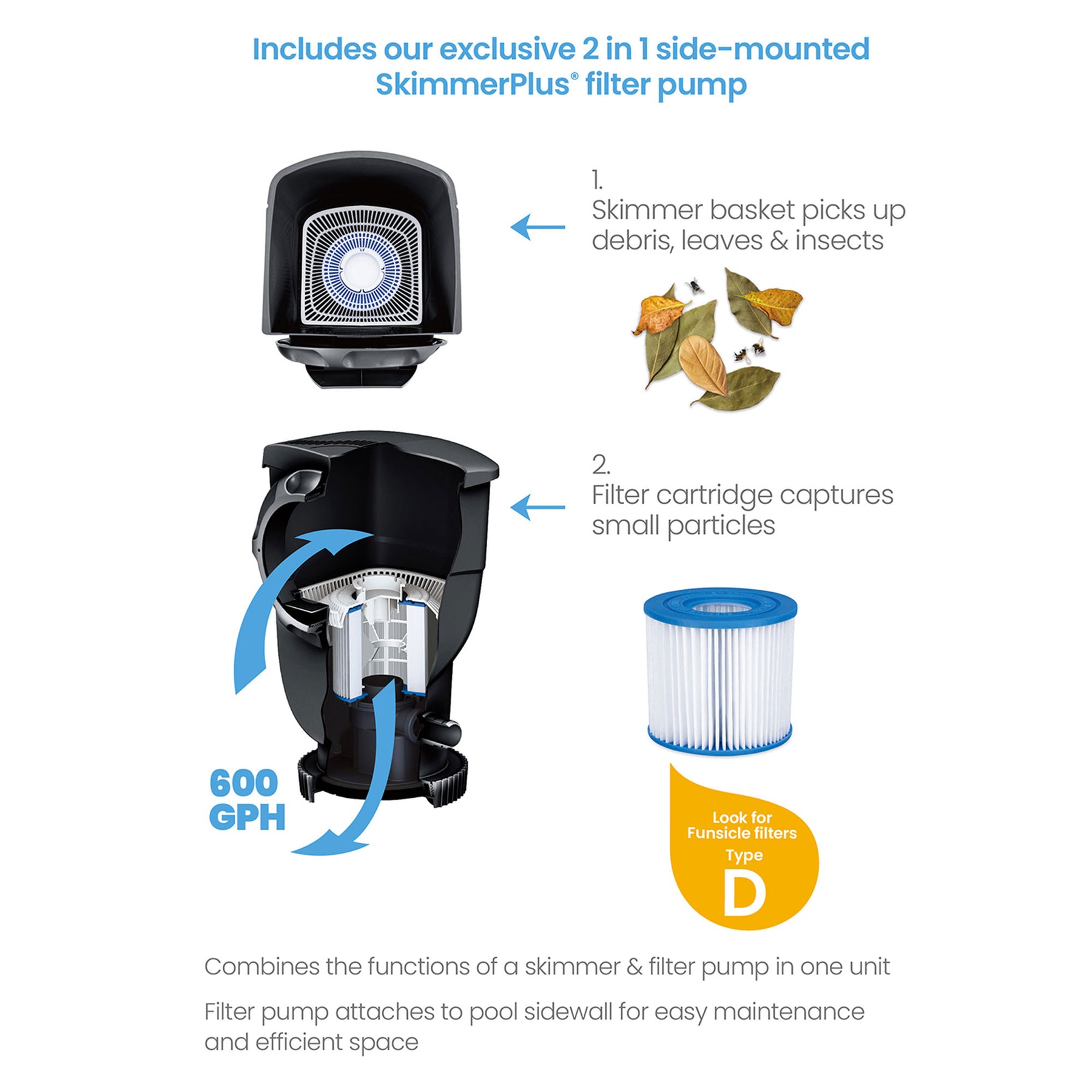 • Includes SFX600 SkimmerPlus filter pump (110-120V with GFCI), Type D filter cartridge, SureStep ladder, and repair patch