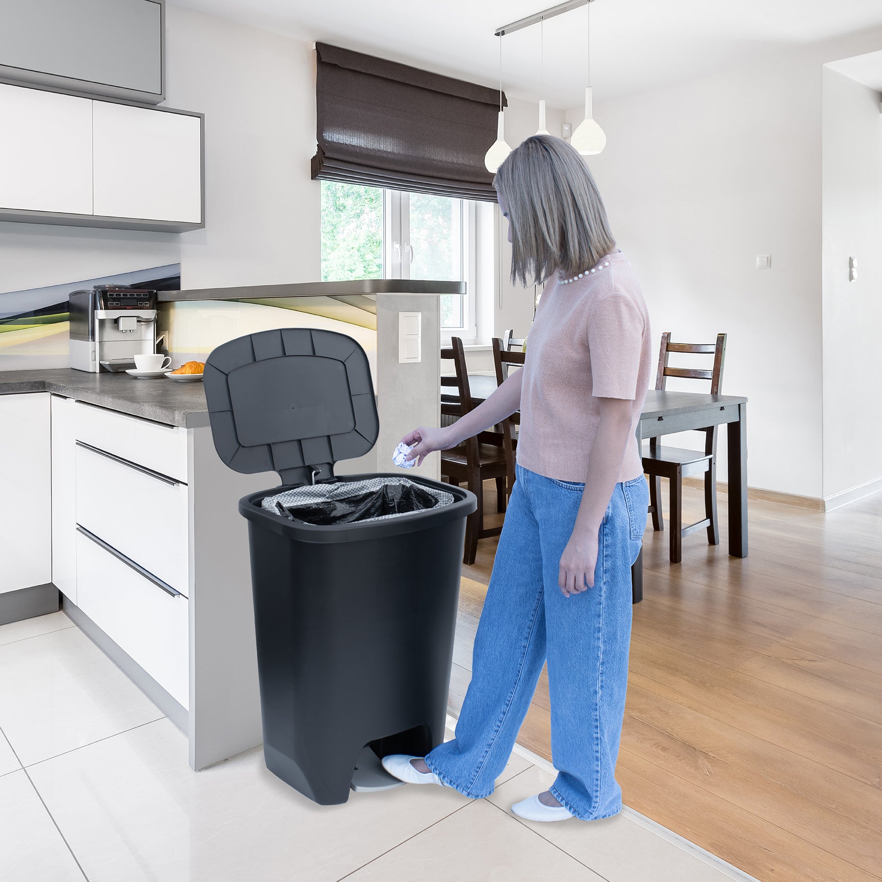 - Stainless steel step pedal design allows for hands-free operation, making it easy to dispose of waste without touching the lid