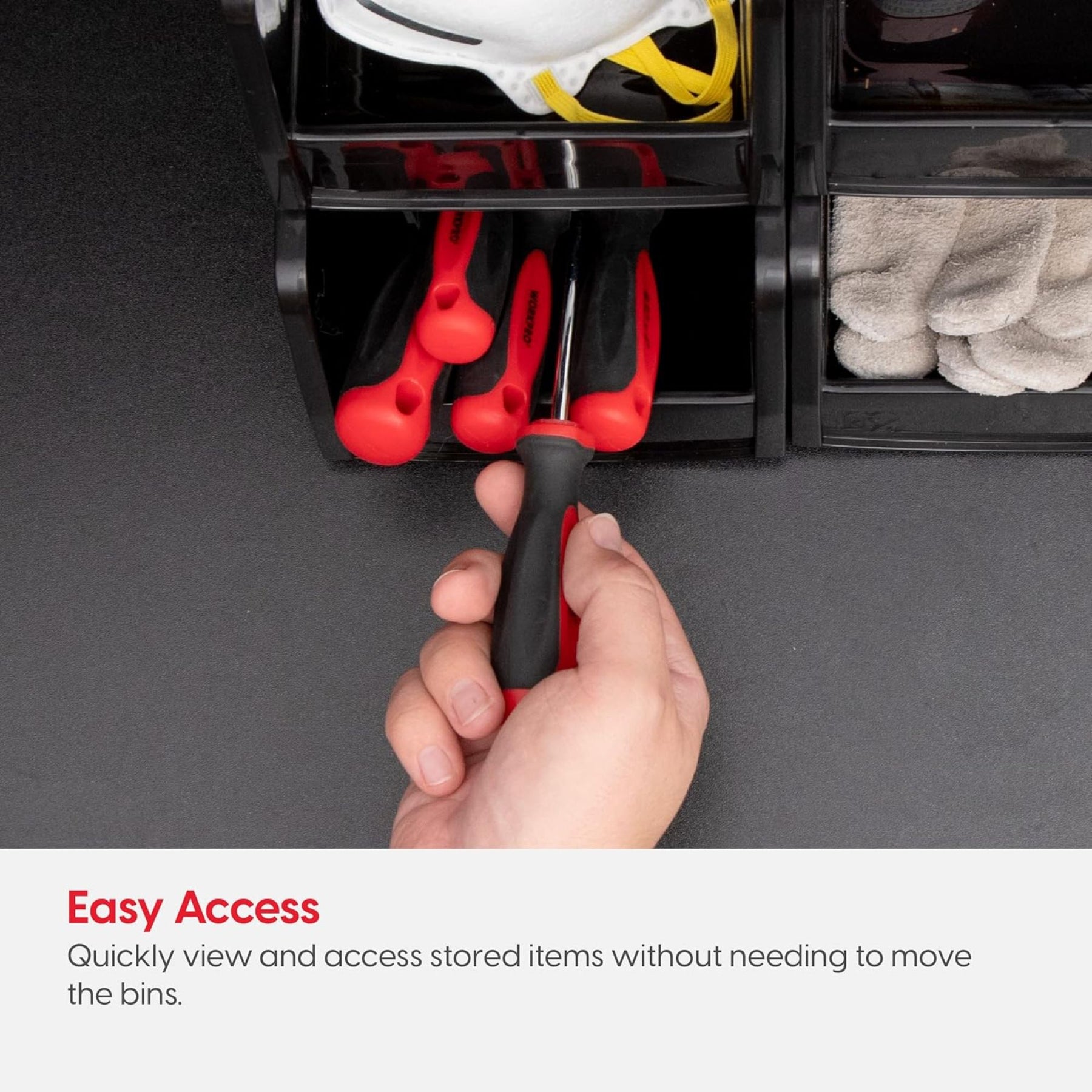 • Jumbo storage bins keep tools, parts, and crafts organized in garages or workshops