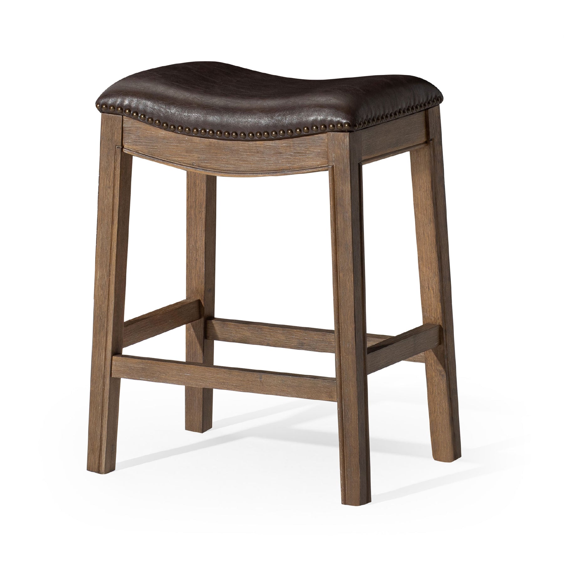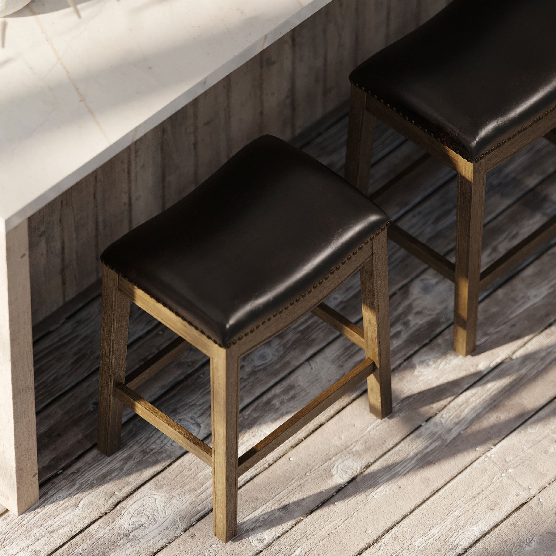 • A timeless masterpiece crafted with vegan leather, our Adrien backless saddle stool blends sophistication and coziness with premium PU leather upholstery, nailhead trim, and multiple wood-finish options