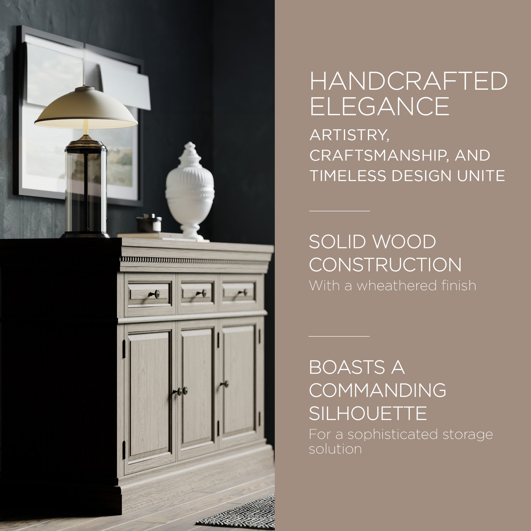This handsome heirloom hutch is pleased to meet your acquaintance. Introducing our rustic, extra-long Theo Wooden Sideboard Server, featuring traditional handcrafted details like raised panel doors and drawers, intricate distressed wood trim pieces, and round metal door and drawer knobs. With classical styling and a rich antiqued finish, this solid wooden sideboard cabinet offers all the space-saving storage needed to house your serving pieces, dishes, and other dining room or breakfast nook entertaining essentials. Its three drawers are ideal for storing flatware and linen napkins, while the spacious buffet cabinets are the perfect place for your stemware and seasonal décor. Bringing style, warmth, and charm into your home is what this sideboard table with storage does best. At Maven Lane, our well-made home furniture is meticulously handcrafted with methods to stand the test of time including hand finishes displaying an impeccable attention to every small detail, and sturdy mortise-and-tenon joinery techniques which promote strength and longevity. Furthermore, by utilizing premium materials and kiln-dried hardwood in our solid wood furniture, we’ve solidified the superiority of craftsmanship you’ve come to expect from Maven Lane. Be sure to view the other pieces in our furniture collection. We've carefully curated an entire medley of heirloom-quality pieces that can be mixed and matched to create the aesthetic your home has been seeking. Given the handmade nature of our products, minimal variations may occur in color, tone, and wood finish.