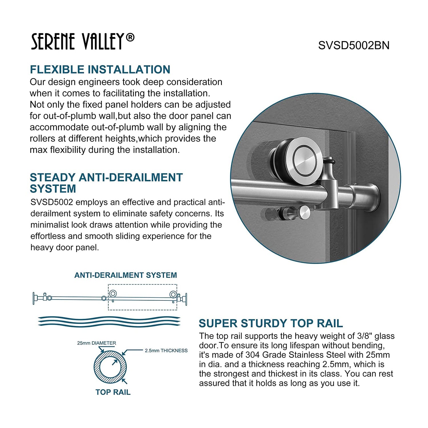 • 4 heavy-duty stainless steel rollers with 3-inch diameters offer effortless, quiet sliding while providing an elegant, classic look
