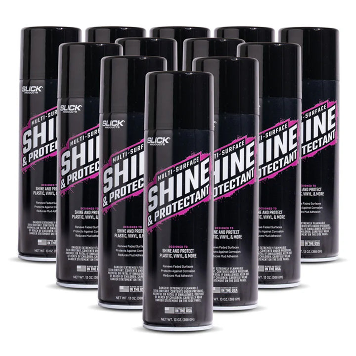Restore brilliance and protect your vehicle with Slick Products Multi-Surface Shine & Protectant. This 12-pack bundle delivers powerful performance with a high-gloss finish that renews, shines, and protects faded surfaces. Ideal for both interior and exterior use, this clear silicone-based spray is safe on plastic, rubber, vinyl, fiberglass, and other non-painted materials.